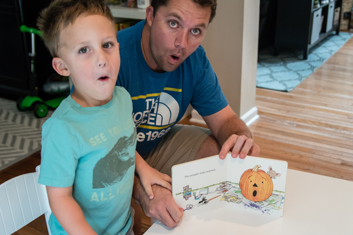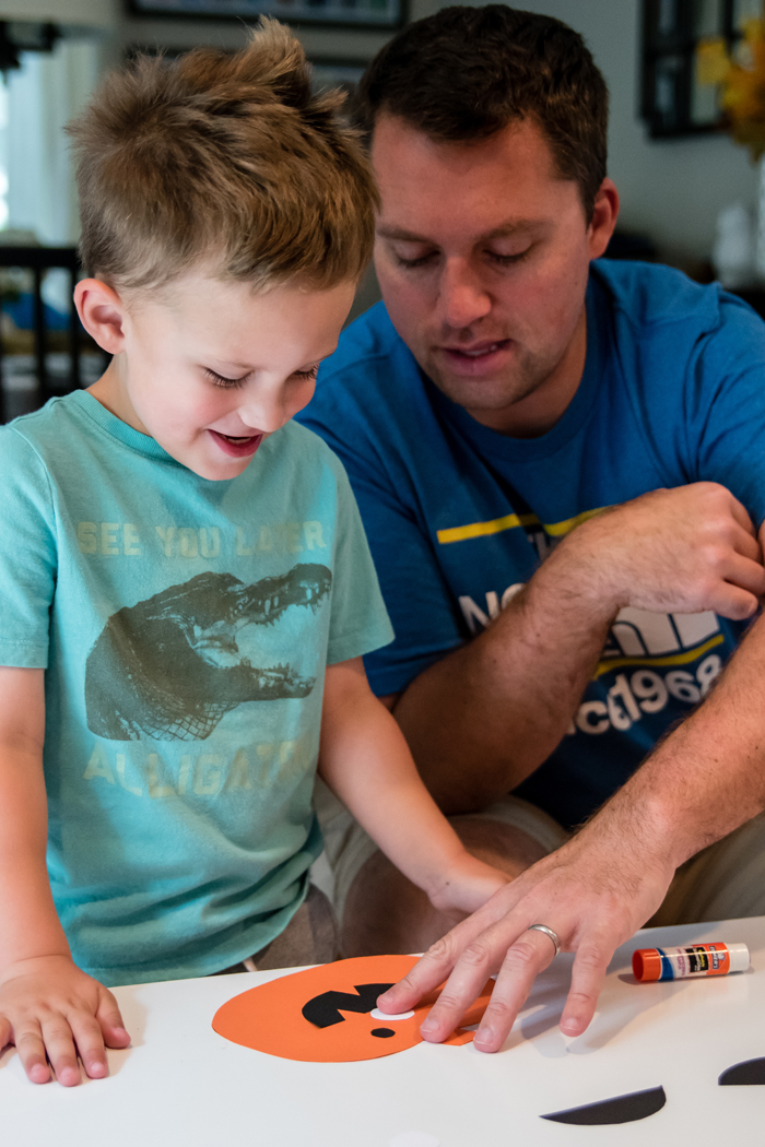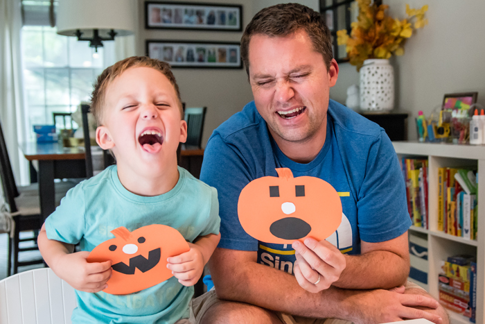 Chris has mentioned in the past that we seem to do all the fun stuff during the week when he's at work. So I decided to hold off on reading the book and doing a corresponding craft until Chris was home. The boys had so much reading the book and even imitated many of the silly jack-o-lantern faces. These two always have so much fun together.
