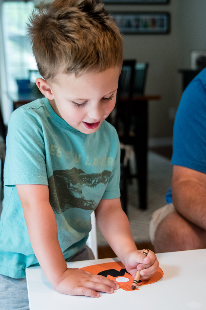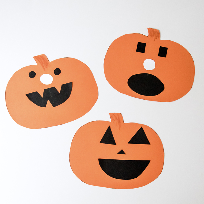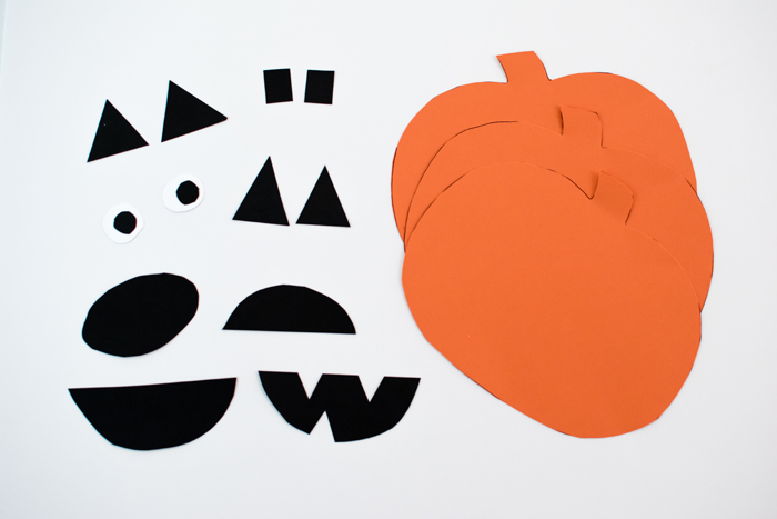 After they read the book, it was time for the craft. One day when Noah was in school, I cut out some orange pumpkins and some black eyes and mouths. I tried to give Noah enough options so that he could make whatever face he wanted. I found the pumpkin template by searching Google images and cut the eyes and mouths free hand.