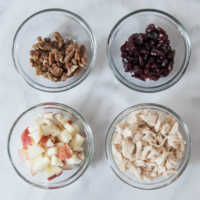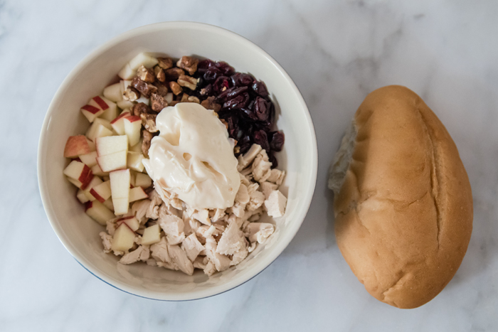 I have always been a fan of chicken salad, but I usually keep it really simple... just some leftover rotisserie chicken and some Miracle Whip on toasted bread. But since it's fall, I decided to make it a little extra special with apples, dried cranberries, and some pecans. I had hoped to pick up some fresh croissants to use as my bread, but my store was all out when I went. So instead, I settled for some simple rolls.