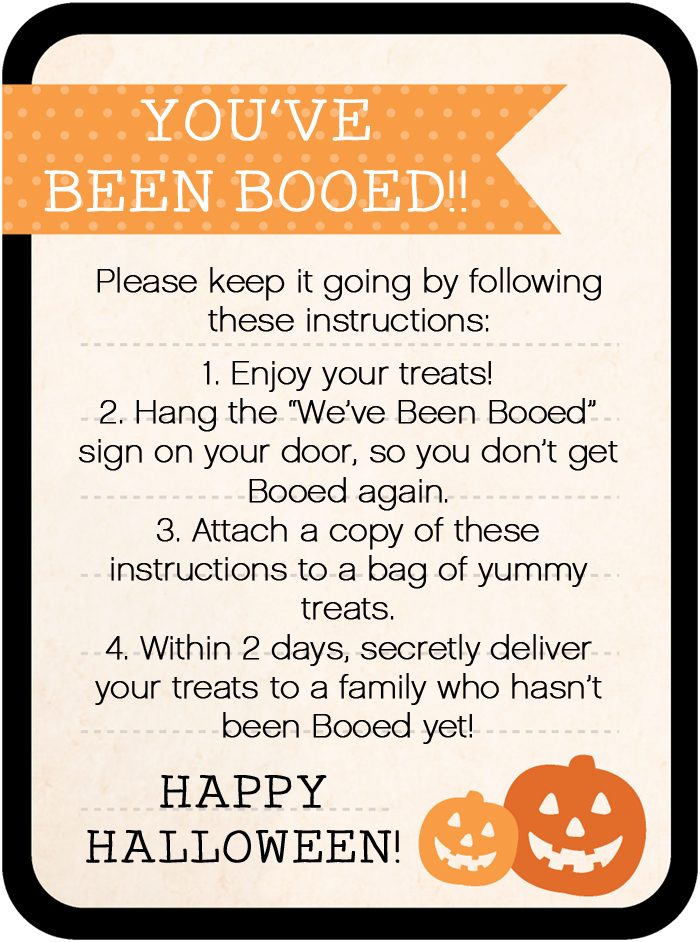 But since these changes won't be necessary for most of you, I've shared the traditional "You've Been Booed" instructions and sign.  If you'd like to start this fun tradition with your friends or neighborhood, simply print both the instructions and the sign and surprise someone with some Halloween goodies!  Happy Booing!
