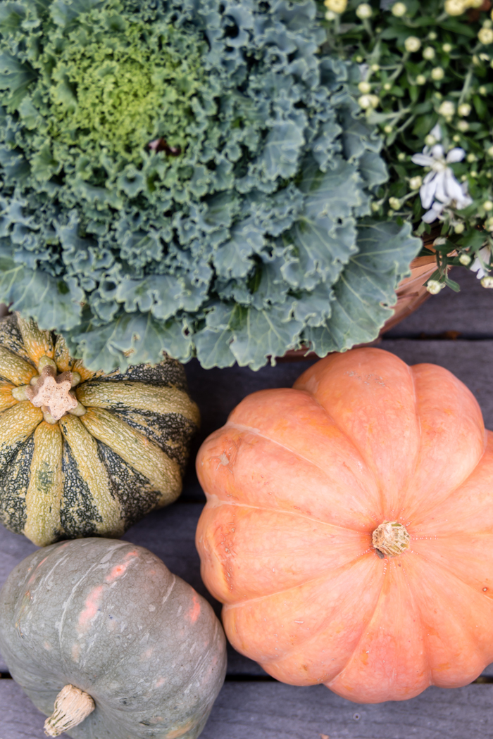 While I've already shared how I decorated the inside of my house for Fall, I didn't show you our front porch. One day last week, I stopped by our local nursery and picked up a floral arrangement and some pumpkins. I just love how the cabbage looks with the mums. And I was drawn to the more muted pumpkins this year. While we will still be buying some traditional orange pumpkins for painting and carving, I really love how these look displayed on my porch.