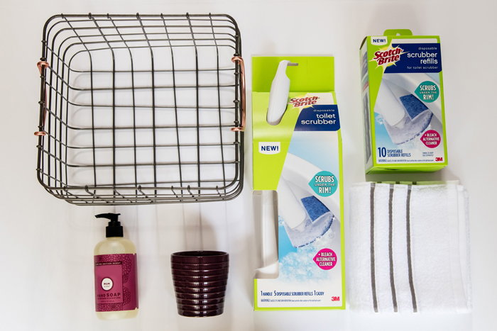 Since I go to Target A LOT, it was a no brainer to get everything I needed, including the basket, while there. I picked up some neutral hand towels (that I just happen to have in my powder room and love!), a hand soap, and a candle. I made sure to get a basket that could not only hold everything, but could be re-used in the bathroom. I love the look of this milk crate basket and think it would be perfect in a bathroom, either holding extra towels or even toilet paper! And while all the decor and finishing touches definitely help make the bathroom pretty and decorated, I also wanted to make sure their bathroom was clean to begin with.