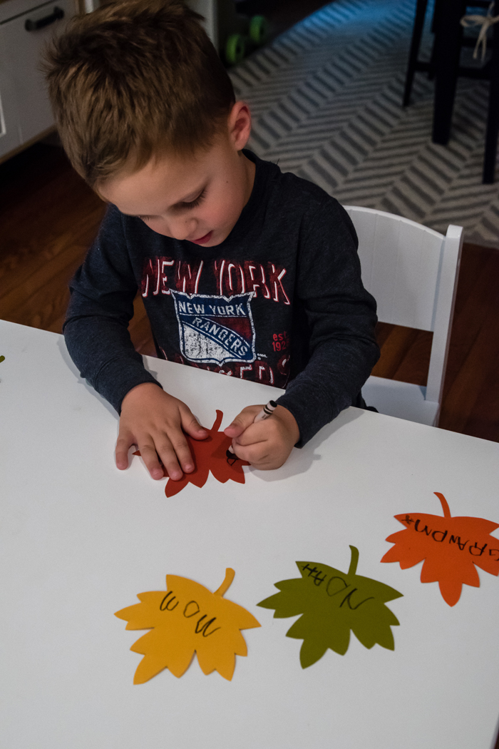 I really enjoyed doing this activity with Noah. A day or two before we actually made the garland, I started talking to him about what "being thankful" means. One day while in the car, we started naming different things we are thankful for, or for Noah, things we are happy to have in our lives. It was a really great conversation and part of me can't believe I have a kid old enough to understand these things! When it was time to make the garland, I reminded him of our conversation and told him he could write anything he wanted. We made sure to save a few leaves so Chris and I could both add things we are thankful for too. I was very pleased that Noah was primarily thankful for the people in his life... I was half expecting Noah to list all of his toys. While he did specifically mention chocolate milk, since it was a long word for such a small leaf, he opted to write food instead. And if I'm being honest, I'm pretty thankful for chocolate milk too ;)