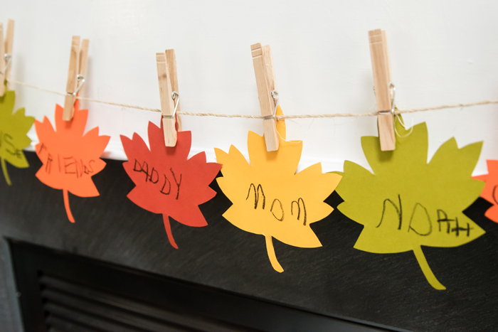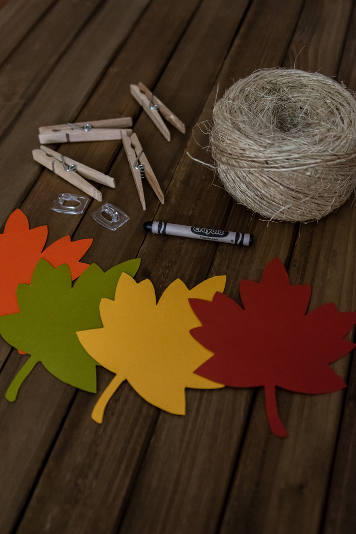 Using nails or 3M hooks, hang your twine wherever you want your garland. Then using clothespins, simply attach your leafs to the twine!