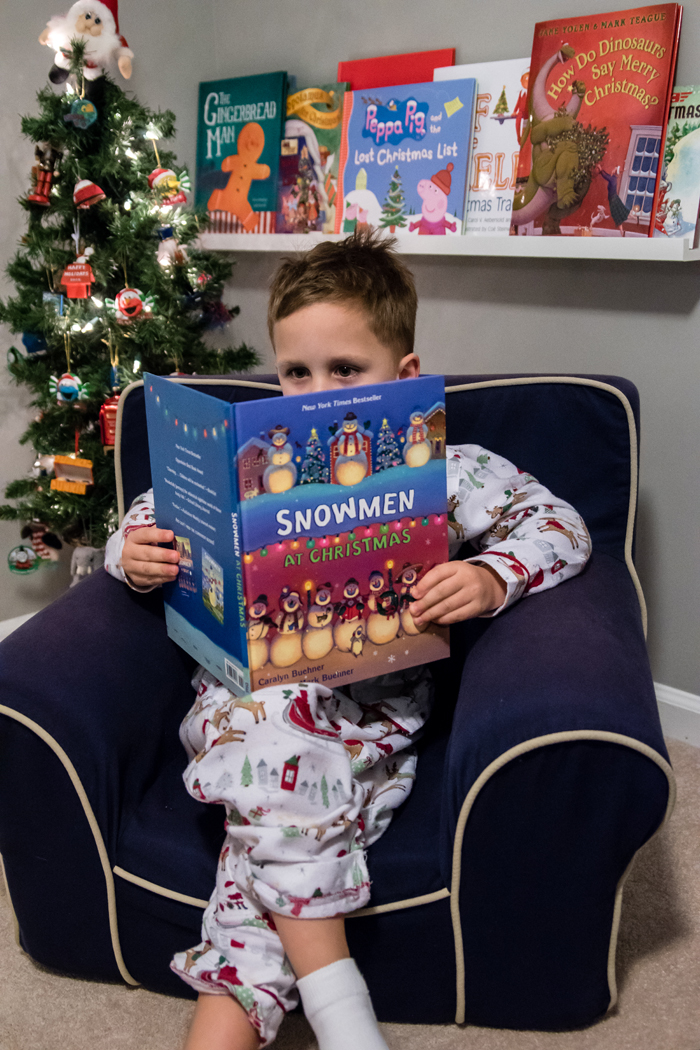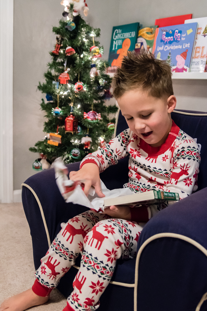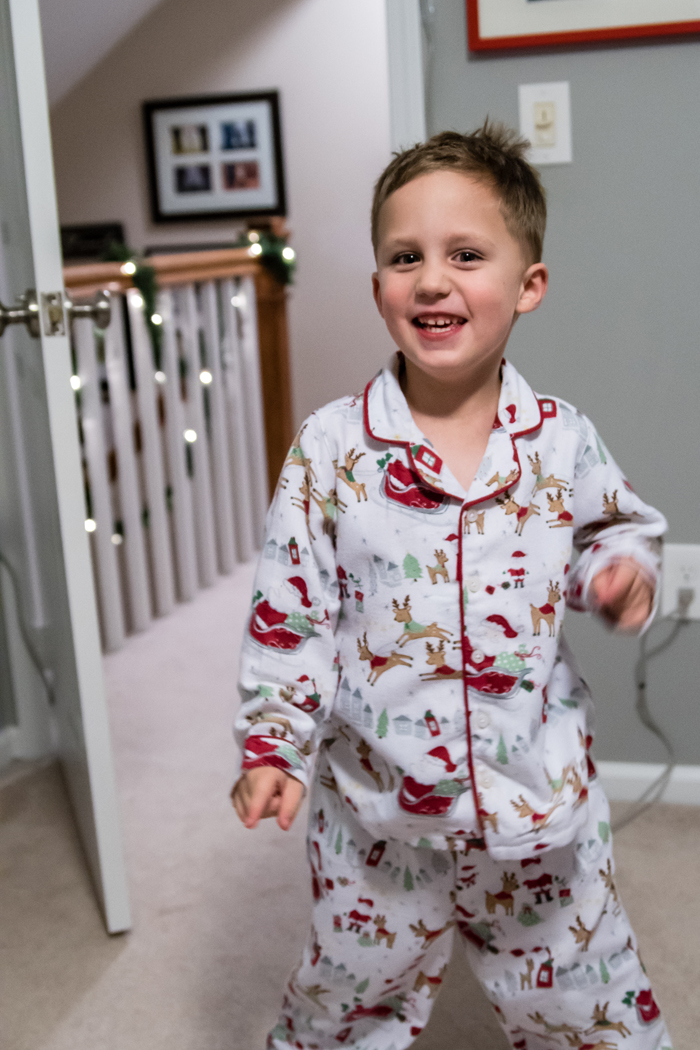 While he might be falling asleep while eating dinner, there's something about having a bath and brushing his teeth that gives him a second wind.  He can get so silly at bedtime!  My favorite part of our bedtime routine is picking out his pajamas each night.  For a while, Noah loved to mix and match his pajamas.  While I think it's adorable, I convinced him that he couldn't do that with his Christmas pajamas.  I guess I'm a purist when it comes to Christmas.  Though I'm sure we will be back to mixing prints in the new year!  Once he's in his pajamas, the negotiations begin on how many photos I'm allowed to take of him.  He'd prefer to get right to opening his "new" Christmas book.  So this year, I compromised and ended up taking more action photos of him opening and reading his books.  But some nights I luck out and he's in the mood for photos and gives me the funniest poses!