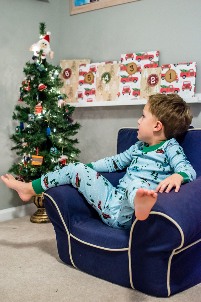 Every year, I have to get Noah a pair of Hanna Christmas pajamas.  I just love them and even have a few new non Christmas pairs ready for him to wear all winter long... I can't wait!  This year, I showed him a few options online and asked him to pick his favorite.  I absolutely love that he loves the red car and tree theme as much as I do and picked this pair!