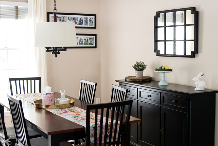 As for our dining room, I kept with my favorite decorating formula.  Since we use our table for much more than dining (think game boards, puzzles, and Lego making), I prefer not to "set the table".  Instead, I cover the table with a seasonally appropriate runner and add my new favorite gold tray filled with pretty decorative accessories as well as the necessities, like a box of tissues (cause Noah always seems to have a runny nose when we are in the middle of a game!).