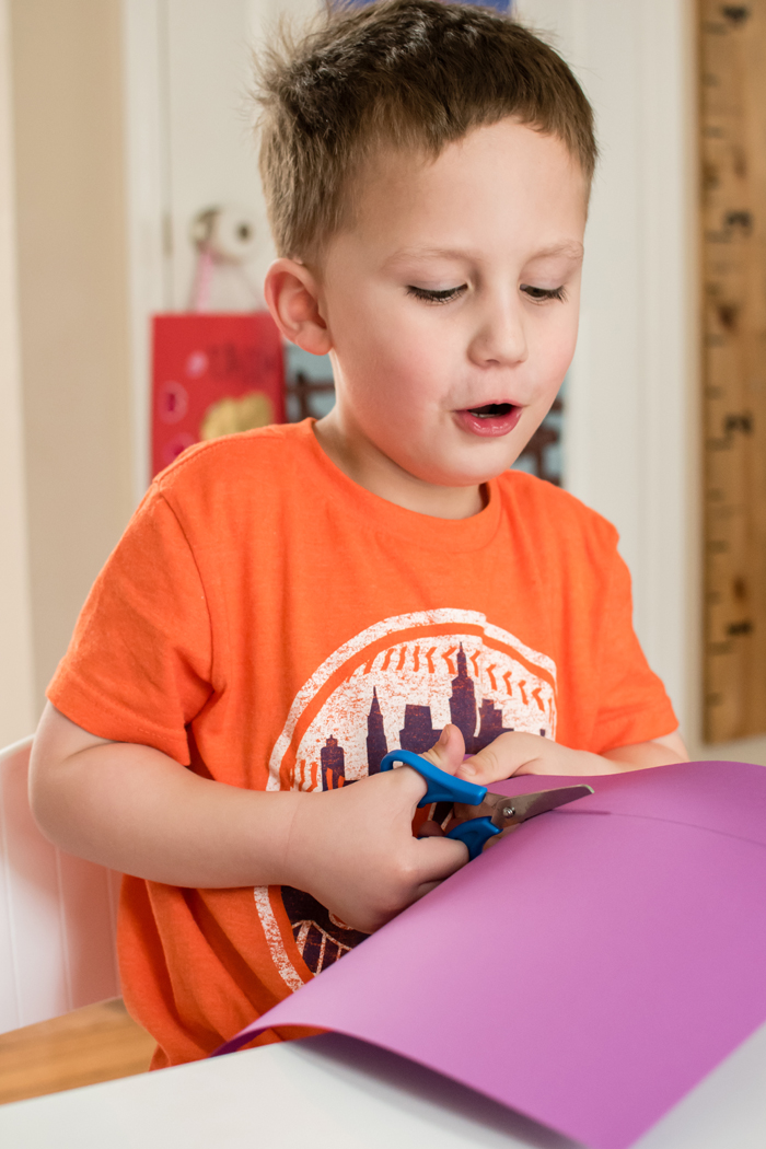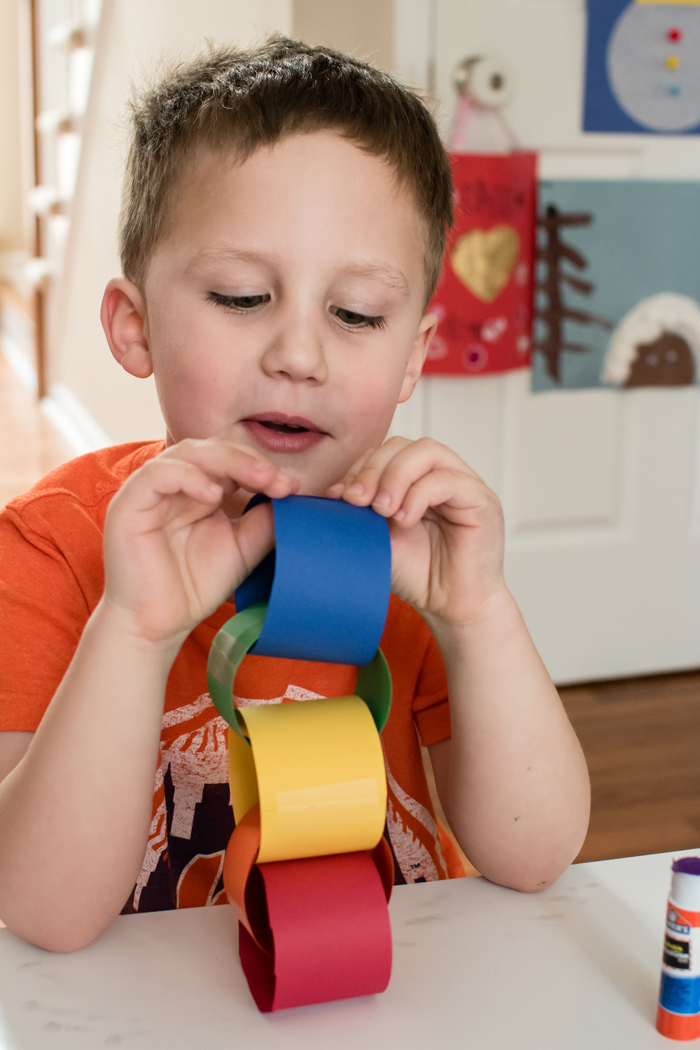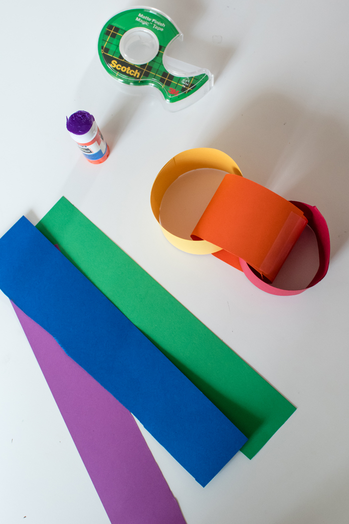 Back in December, my mom showed Noah how to make those paper chains and he absolutely loved it.  I thought this would be the perfect opportunity to make another paper chain... this time as a rainbow of sorts.  I measured out 2 inch strips onto each color paper and Noah did all the cutting.  As long as Noah takes his time, his cutting skills are top notch.  I then helped him glue each of the strips into rings, connecting them all in rainbow order.  Noah is a pro with the rainbow colors (partly because of Mickey Mouse Club), but this would be a great activity to help your child learn the colors and the order.  Then just to make sure they were secure, I also added a piece of scotch tape.