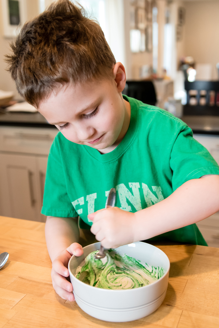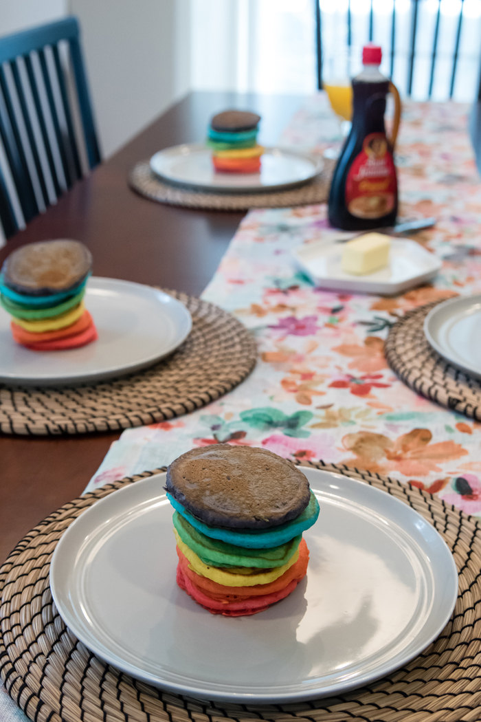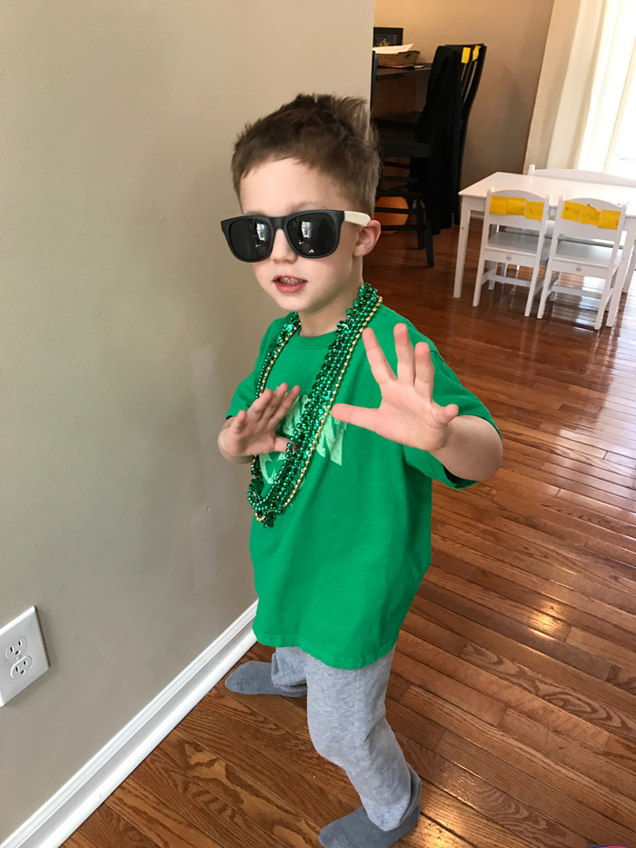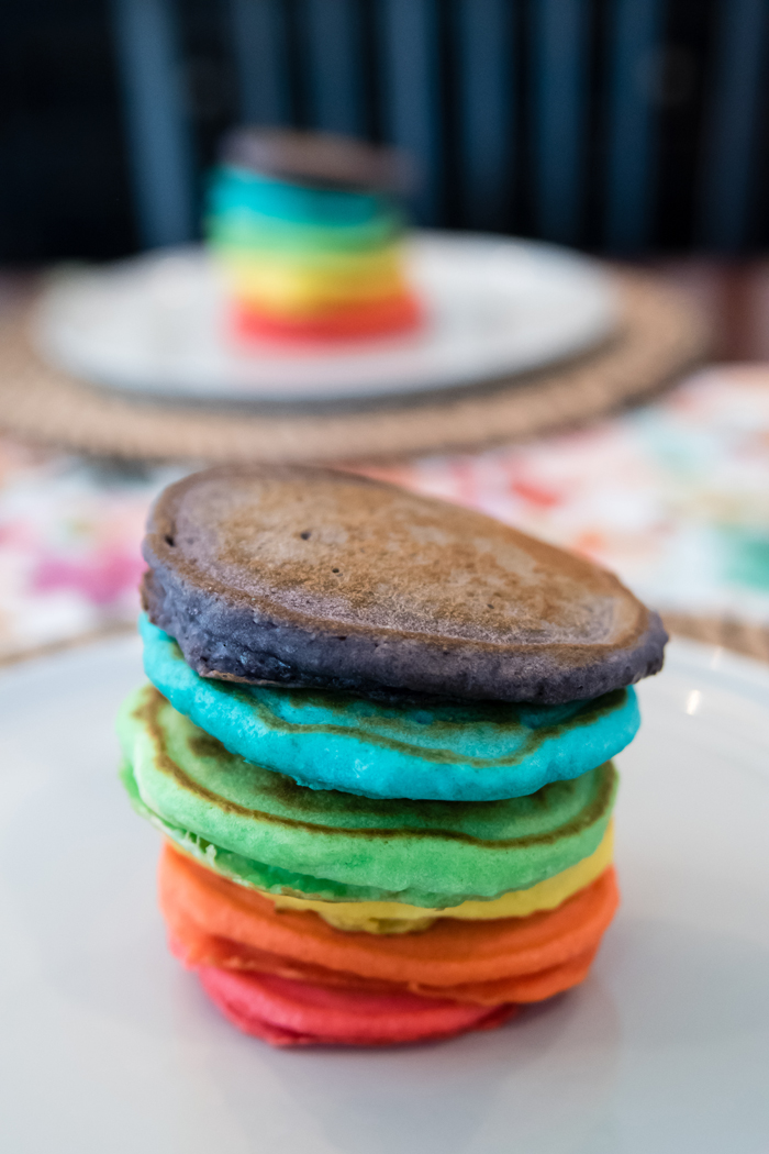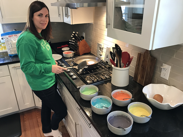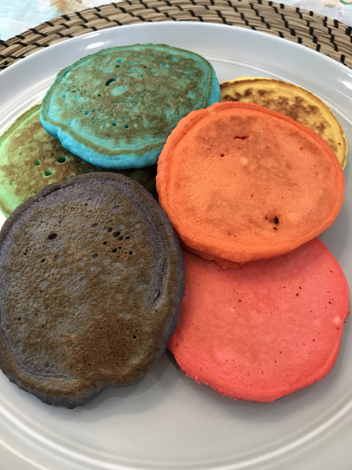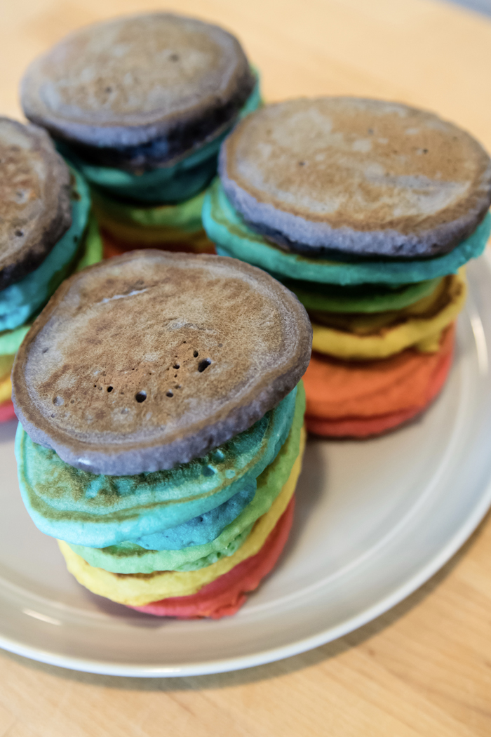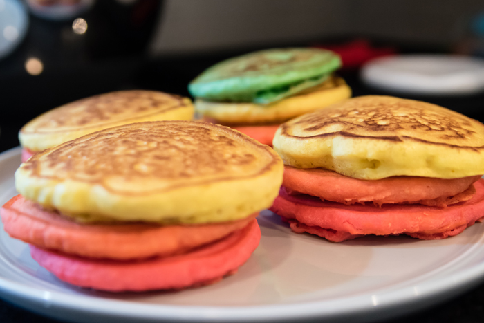 And just like in 2015, we had a Rainbow Pancake Breakfast.  Since our last pancake breakfast, I've been making quite a few pancakes.  It's one of Noah's favorite breakfasts and requests them to either be in the shape of Mickey Mouse or to be a certain color.  While we stick with one color on a regular day, we enjoy making all the rainbow colors for St. Patrick's Day.  I use the Krusteaz Buttermilk Pancake mix (I get the big bag from Costco) and simply add some gel food coloring.  It really could not be any easier!  My only issue is figuring out how to keep them warm while I make them all.  Should I put them in the oven??  I would love some suggestions!