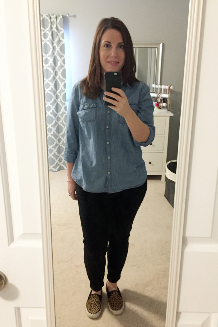 chambray shirt | black jeans | leopard sneakers (old Gap, but these are similar)