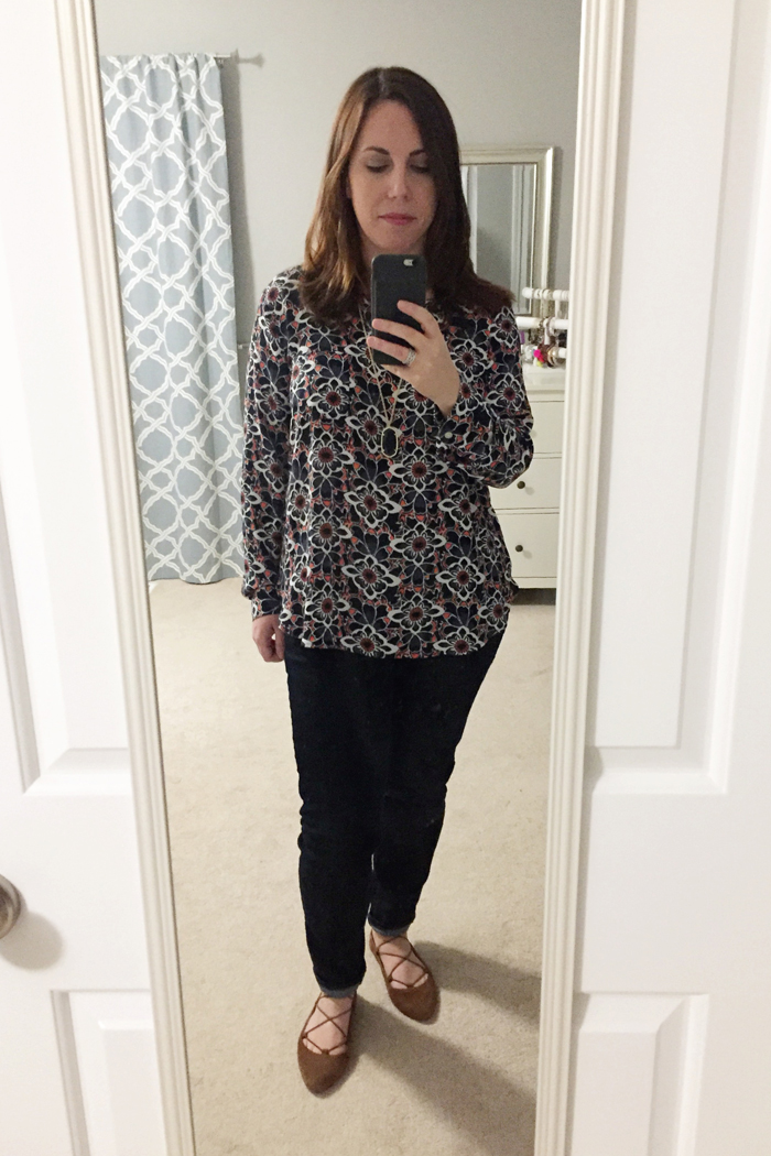blouse (old Loft, but this is pretty print for spring) |  jeans | lace up flats | necklace (with tassel)