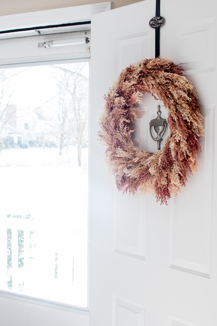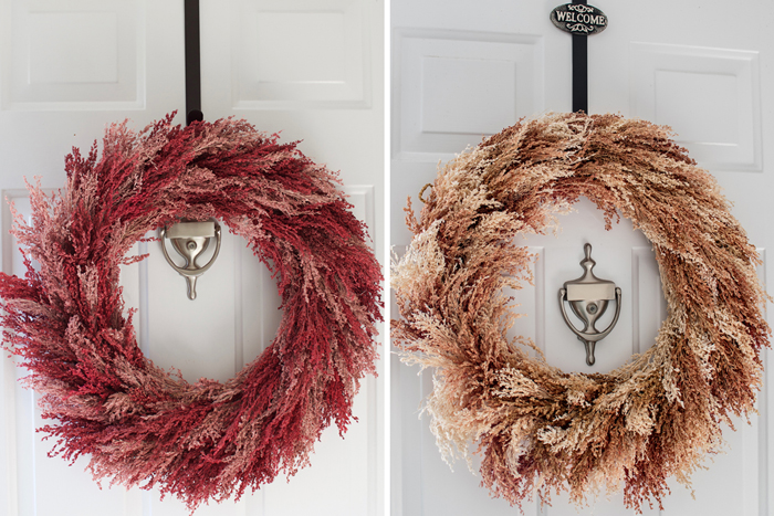 Another piece of decor that I bought last year is this pink wreath.  I knew it had faded when I was putting it away last year, but I didn't realize how much until I compared these photos side by side.  While I love the amount of sunlight our house gets (especially for indoor photography reasons), I have a real problem with fading wreaths.  My boxwood wreath looks so horrible after one year that I am embarrassed to use it again.  While I love how vibrant this pink wreath was when I bought it, at least this one looks like it could have been light pink all along.  I wonder what it will look like by next year!?!