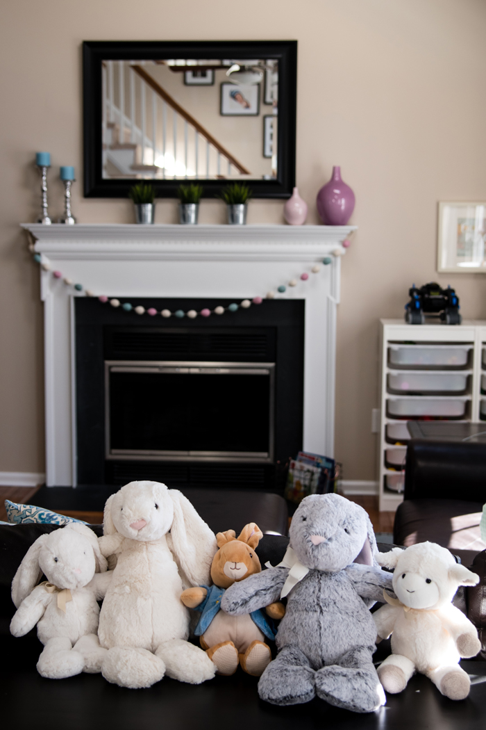 Over the years, we've collected quite a few stuffed bunnies.  They really are the perfect addition to an Easter basket.  Many of these are from Pottery Barn Kids, but the Jellycat bunnies are some of my favorite... and softest!  While we don't keep them out year round, I love pulling out these super soft stuffed bunnies (and sheep), and displaying them as some kid friendly "decor".
