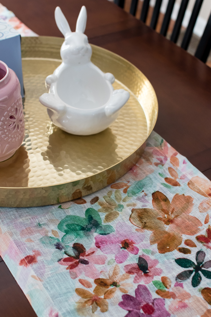 I've had this bunny candy dish for years and love filling it up each year.  It must be a popular item, because Pottery Barn still carries it at least 6 years later!  I'm actually shocked I haven't picked up any Easter candy yet... I definitely plan to remedy that situation as soon as possible!  And can we talk about this runner!?!  Another gift for my birthday last year that I was so happy to take out this Spring.  I love the delicate material, but my favorite part is definitely the beautiful floral print.