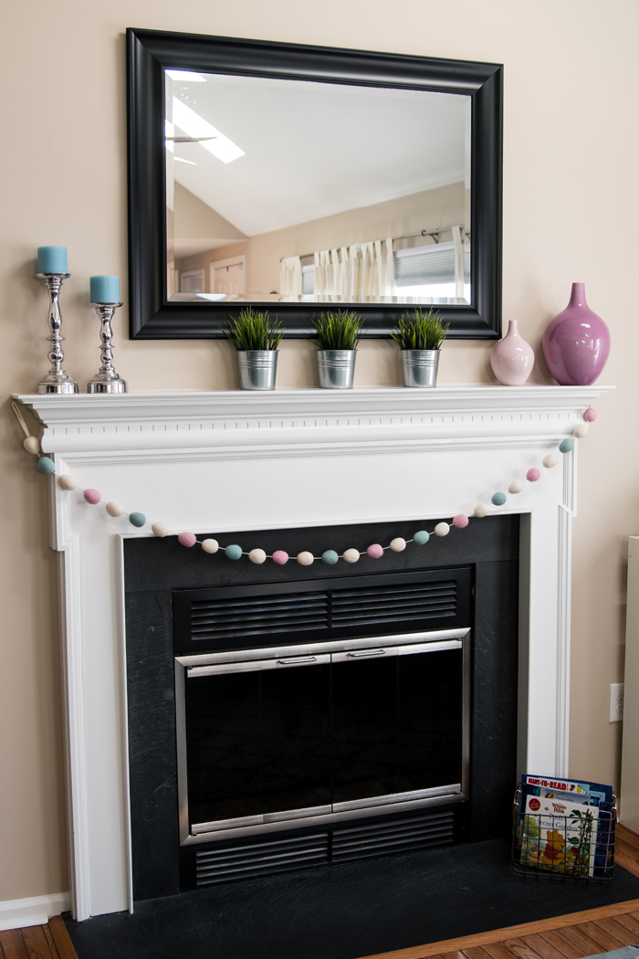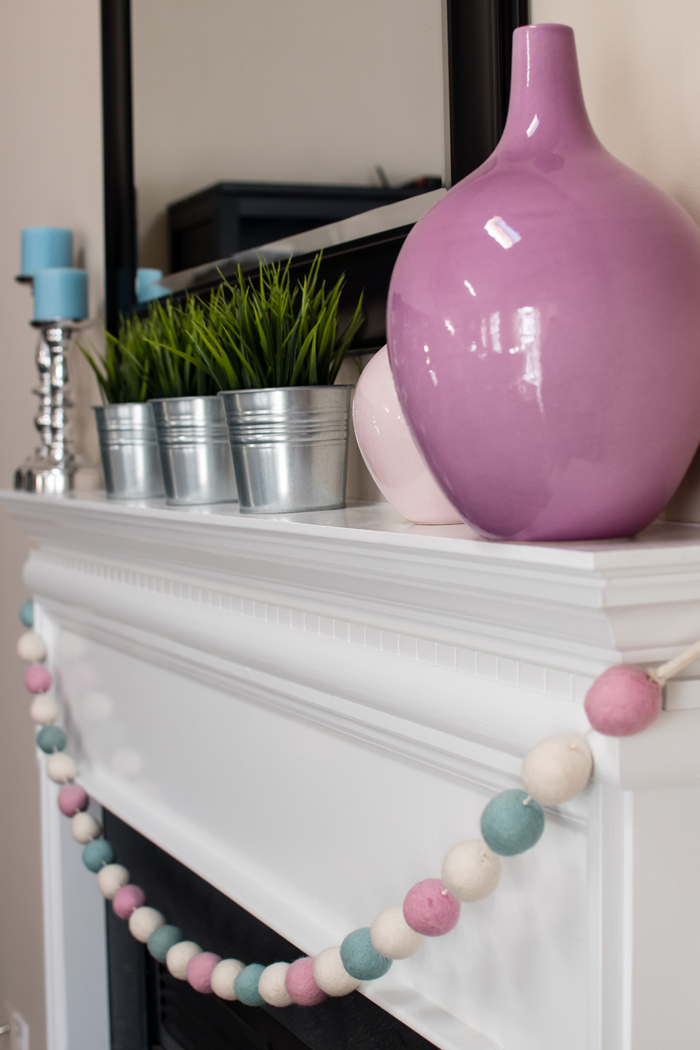 When decorating for any holiday, I usually stick with the living room and dining room and add a wreath to the front door.  First up is the living room.  When we lived in an apartment I couldn't wait to have a fireplace.  Not because I wanted to sit by a roaring fire (we have never used this one for it's real purpose), but because I was desperate to decorate a mantel.  And I'm happy to report that I still love switching up my mantel decor based on the holiday/season.  Just like last year, I hung my egg garland, put up my blue candles and pots of fake grass.  But this year, I switched out the vases for these pink ones I got for my birthday last year.  I love how the pinks and blues from the garland are repeated in the candles and vases.