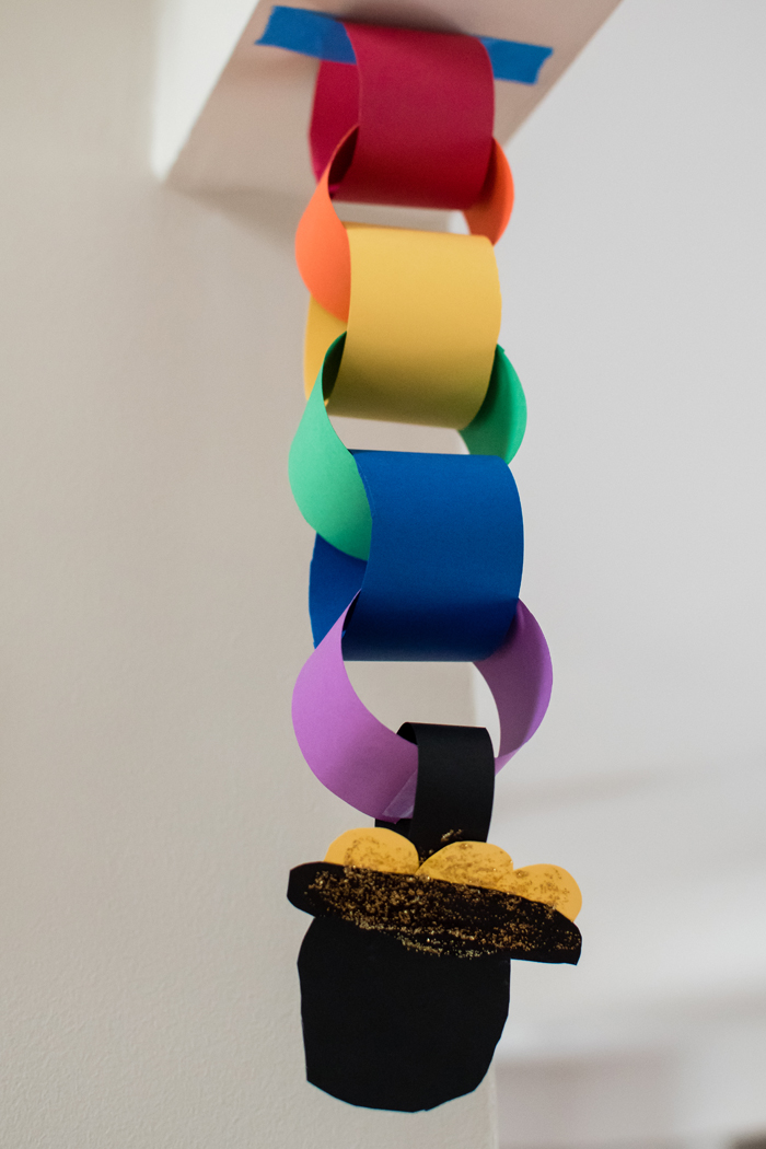 Finally, we added a little pot of gold to the end of our rainbow chain.  I freehanded the pot and then used the cap from a bottle of water to trace the gold (yellow) coins.  Noah glued the coins to the pot and then added some gold glitter glue for some extra sparkle.  I cut out a short strip of black card stock in order to attach the pot of gold to the rainbow chain.