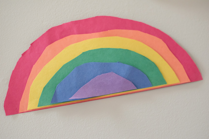 And speaking of rainbow crafts.  While I'm usually the one to do crafts with Noah, I'm always surprised and impressed with the things Chris and Noah sometimes come up with.  While I got the construction paper for them, they came up with the plan for this rainbow all on their own.  And just as Noah doesn't always agree with my artistic visions, he was also debating with Chris on how to execute this rainbow.  He didn't understand Chris' idea to make the red the largest semi circle and keep adding smaller semi circles in the remaining colors.  But once he understood, he was on board and they made this really cool rainbow!  So simple to make and really great for your child to practice cutting and gluing.