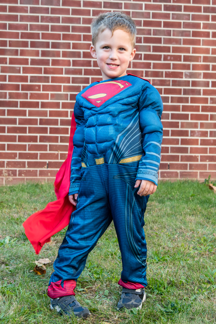 Next up... Superman! We were in Costco one day when Noah spotted the costumes. We were with my mom and she offered to buy him a second costume (Hulk being the first). At first Noah wanted to be Iron Man, but then he changed his mind since he doesn't love masks (hence why I'm surprised Noah likes the Gekko costume so much). He then saw Superman and realized he doesn't wear a mask. The fact that it had a prop was an added bonus!