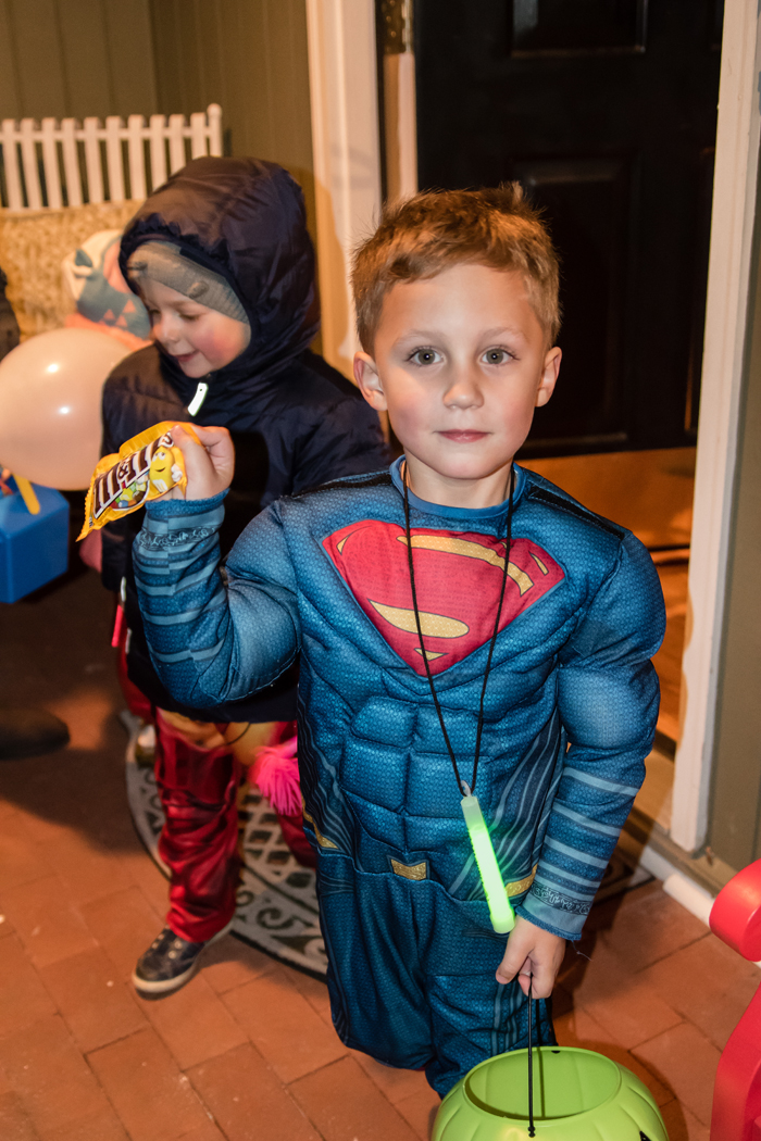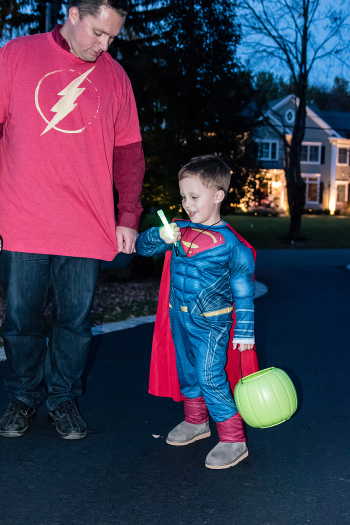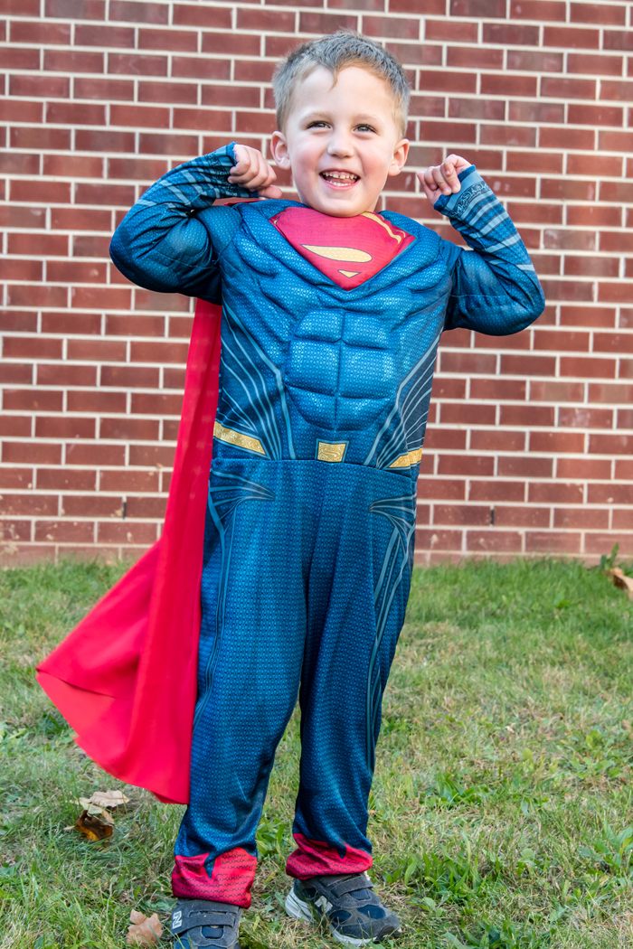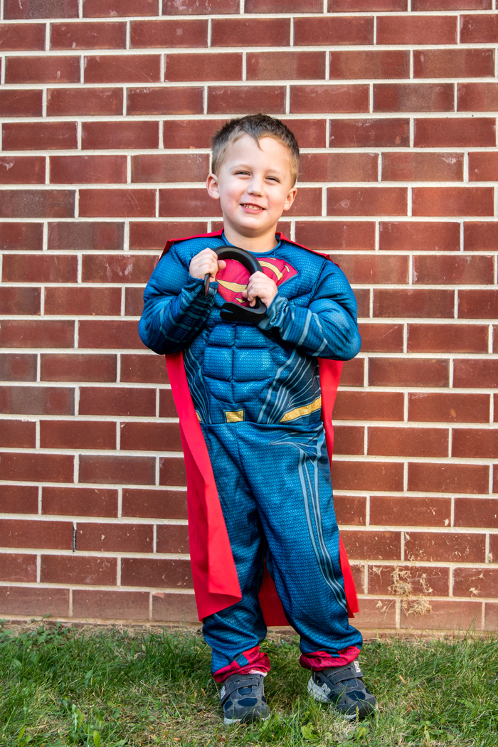 I love that the cape is attached by velcro... again, so much easier to wear your costume in the car! I am kind of cracking myself up just writing this... who knew I'd ever be so obsessed with velcro!?! And how cool is the pretend steel that is easily bendable!?! Get it... "Superman, the Man of Steel"! Not sure how it will go over on actual Halloween, having to carry his bag of candy and his steel, but I'm sure we will figure it out... most likely me carrying both ;)