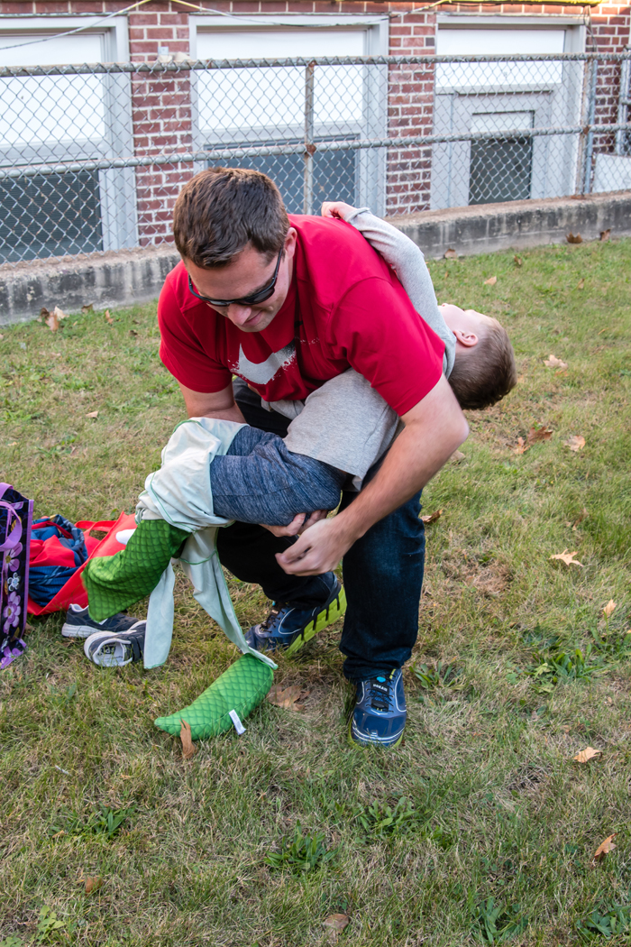 One of the things I love about this costume, is that the tail is removable. If you look closely above, you can see how it is attached to his back with velcro. In my opinion, this is genius. It makes it so much easier for him to wear his costume in the car. And if your child is allowed to wear costumes to school, this makes it possible for them to easily sit at their desk!