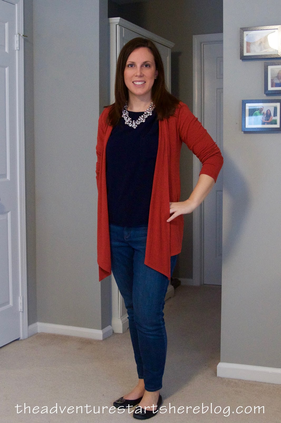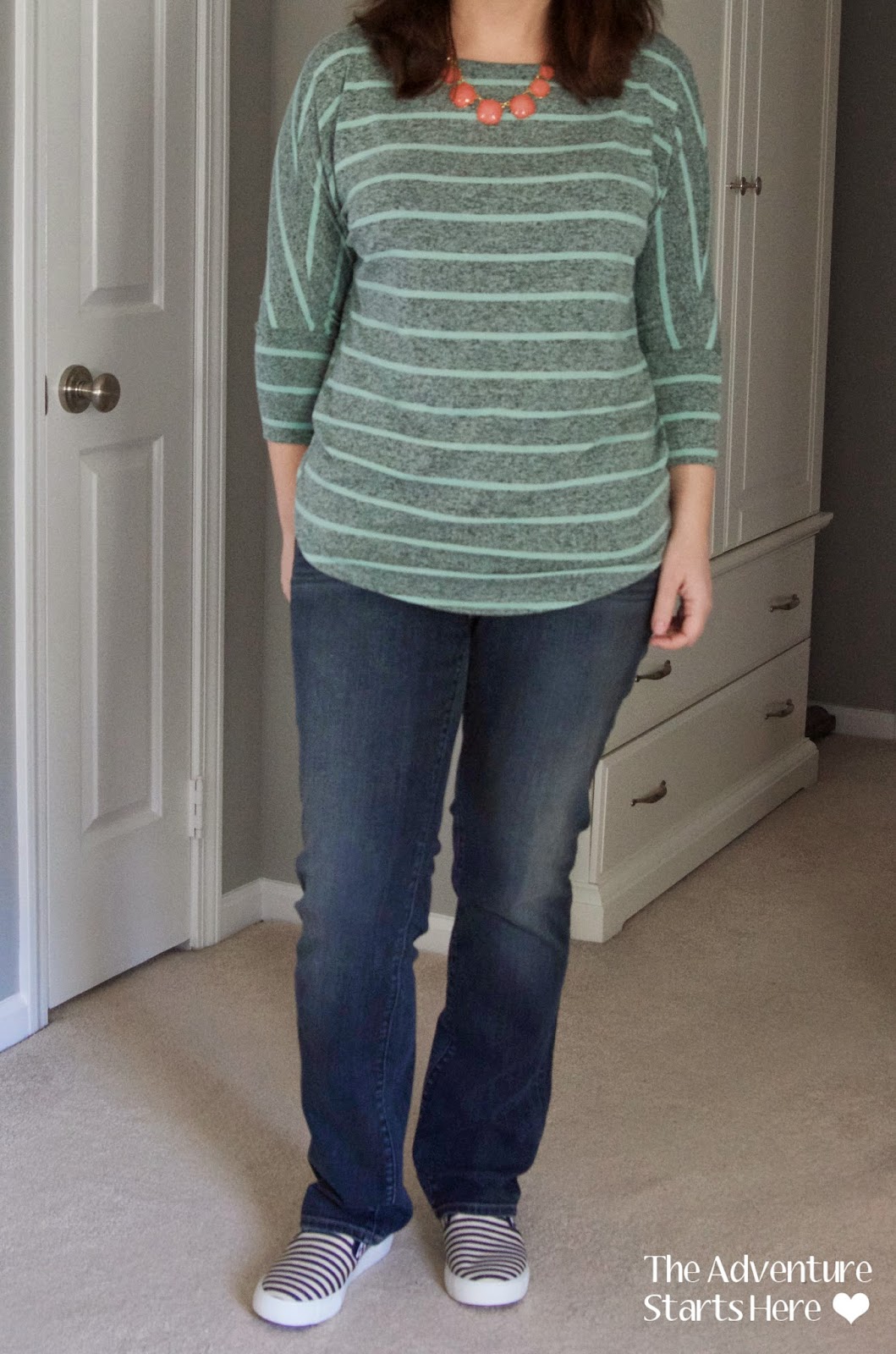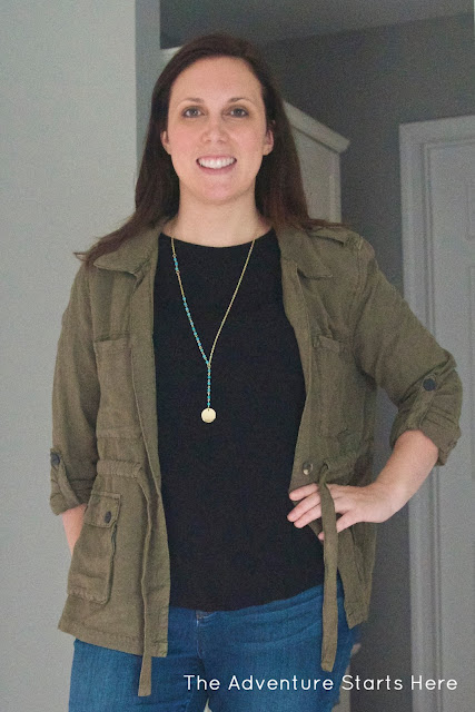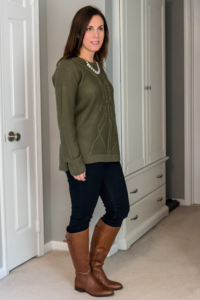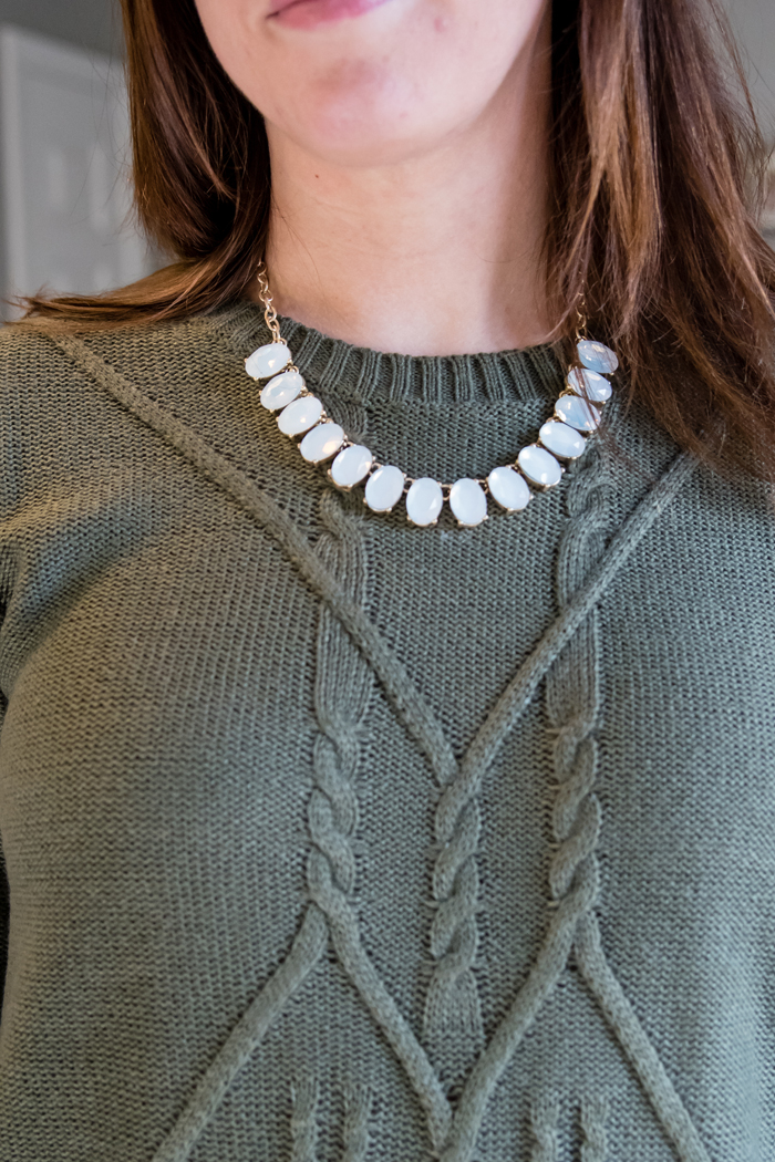 For the first outfit, I'm wearing three of the pieces that I received. The Clae Cable Front Pullover, Elizabeth Super Skinny Jean, and the Jackie Oval Stone Necklace. It's funny, because while I love this outfit, when I first pulled the jeans and sweater out of the box, I was a little skeptical. The jeans don't have a button and zipper, but are more like leggings. At first I was disappointed by this, and actually wondered if they sent me maternity jeans, but this is now one of my favorite features of these jeans. The best part, is they still have real back pockets and work really well with my riding boots. While I can cuff them to wear with booties or flats, I'm contemplating hemming them if I decide to wear them that way more often. And as for the sweater, I was hesitant because I often have a hard time finding sweaters that I like. They are either too fitted, too loose, or just look too bulky. But I really liked the color, the detailing, and I really love how it looks on. The necklace is really pretty, but I honestly have a few very similar necklaces. If I didn't though, I totally would have kept it!