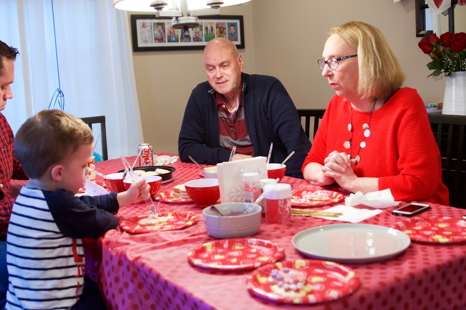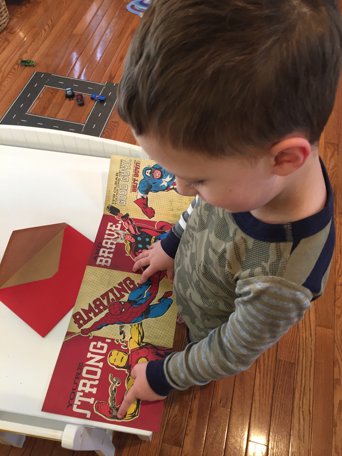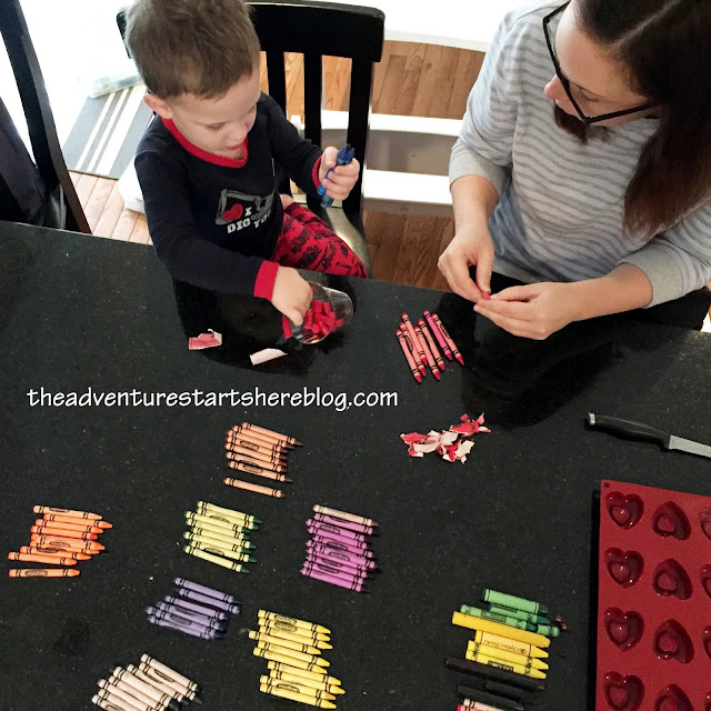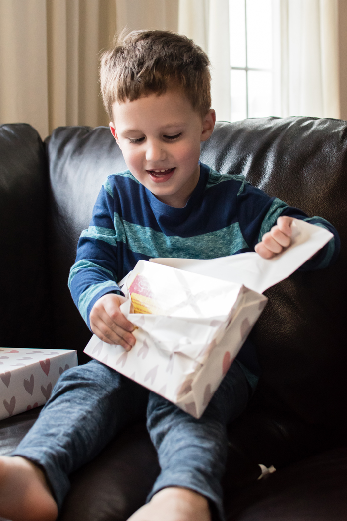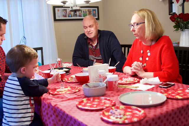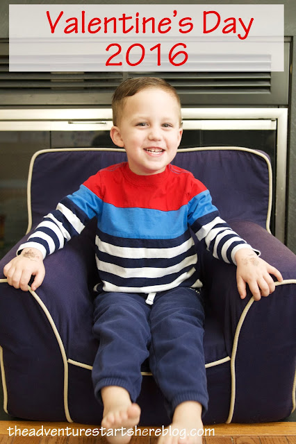 Being that Valentine's Day was on a weekday this year, it felt a little different. Not that we necessarily go all out when it's on a weekend, but I have to admit that Chris and I really do like to shower Noah with love and treats. So while Chris and I had our "Valentine" date over the weekend, we still tried to make the day special for Noah, even if Chris had to work. Our Valentine's Day was filled with festive food, a craft, and a few gifts.