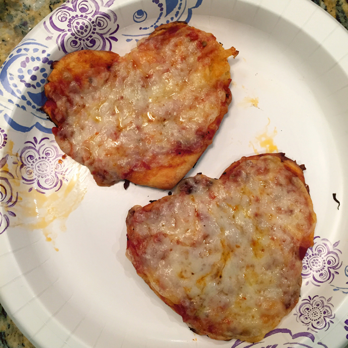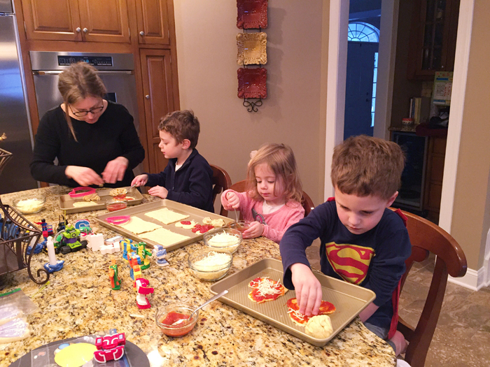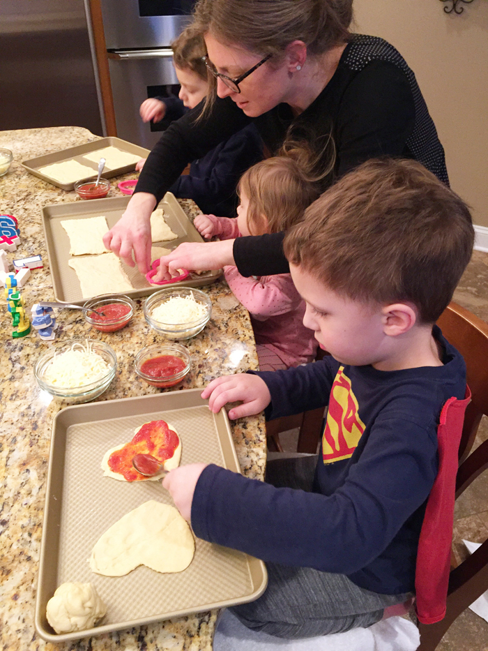 On Valentine's Eve, we went over to our friends' house for a play date and made some heart shaped mini pizzas with the kids. Some sauce spilled over and more cheese went in their mouths than put on the pizzas. But the kids had fun, and the pizzas still resembled hearts when they came out of the oven, so I call it a huge success!