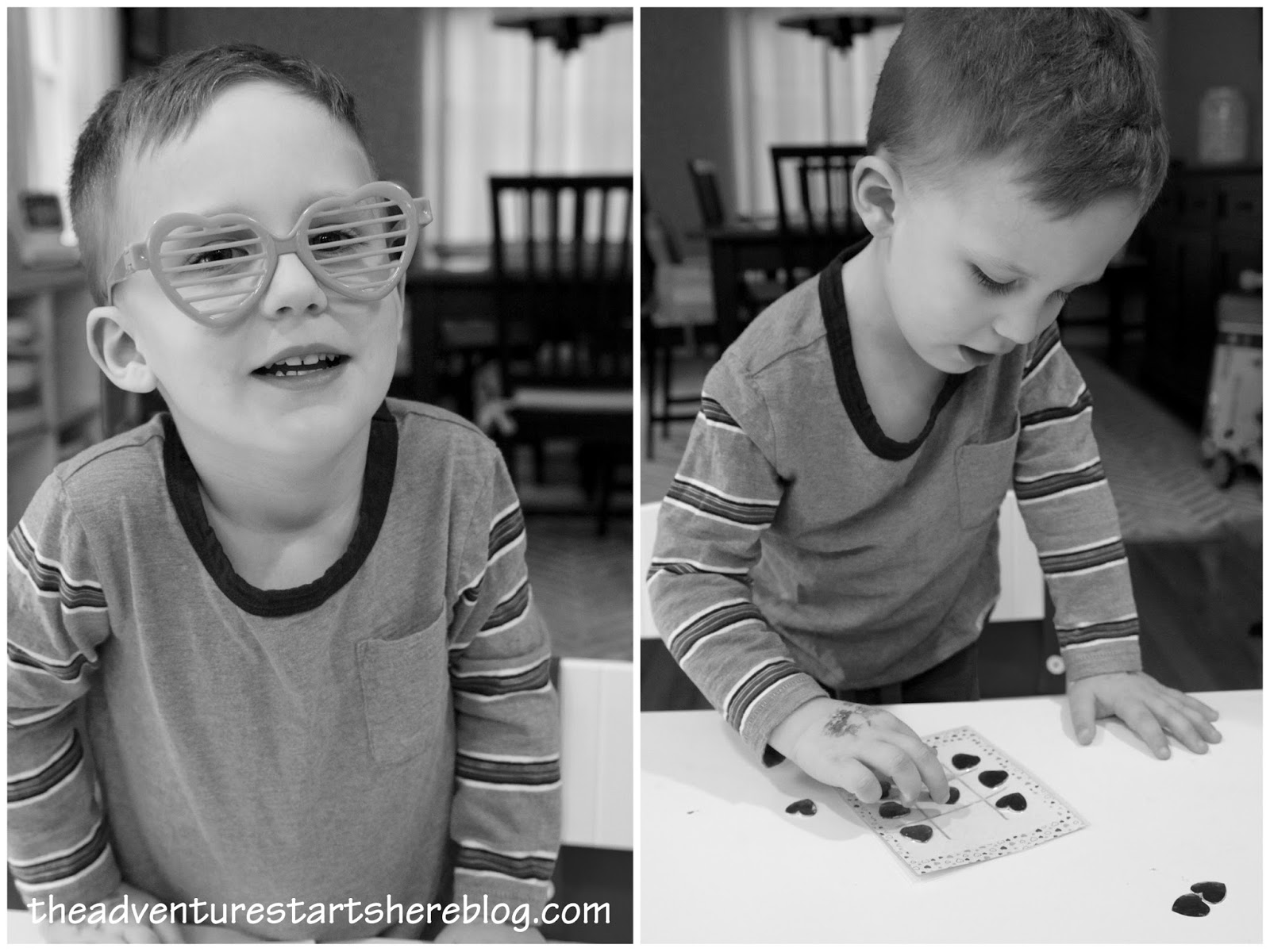 Noah had so much fun doing the "Buddy the Elf" scavenger hunt, that I knew I wanted to do another one for him for Valentine's Day. After he fell asleep, I hid some heart shaped clues all over the house while Chris blew up a bunch of balloons to hide in the basement as the "treasure" at the end of the hunt. The clues were things like "your favorite drink", which led him to the chocolate milk in the fridge and ended with "where you and Daddy play on the weekends", which led him to the basement to find the balloons! He got every clue really fast, and was only confused by the last one, guessing that he and Daddy usually play in living room, not the basement. He loved the scavenger hunt and I definitely think this will have to be a new tradition for us!