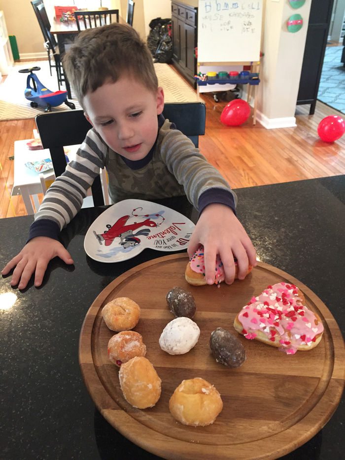 And even though Chris had to work on Valentine's Day, he still managed to surprised Noah and me when we came downstairs in the morning. Balloons, roses, and lots of sweet treats greeted us when we walked in to the kitchen. While I had originally planned to make Noah some red pancakes for breakfast, as soon as we saw the donuts, those plans changed!