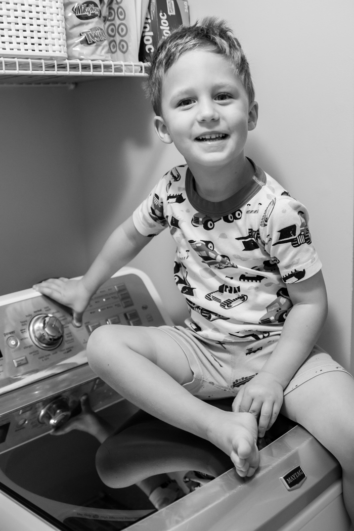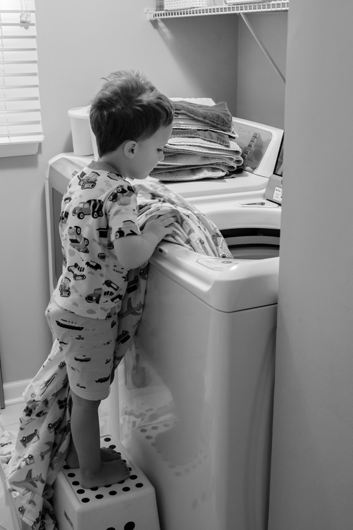 9:45... The first set of sheets are done, so I switch them to the dryer and ask Noah if he wants to help put his sheets in the washing machine. It's hit or miss whether he wants to help or has no interest. But I like to play it safe and ask, because he's been known to get upset cause he thinks I should have known that that particular time he wanted to help.