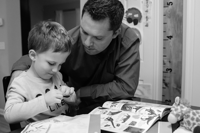 7pm... Chris is finally home, and Noah bugs him the entire time he's eating his dinner to help him do this dinosaur sticker book. I help him while he waits for daddy, but as soon as Chris is done, Noah wants nothing to do with me.