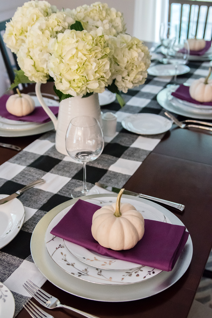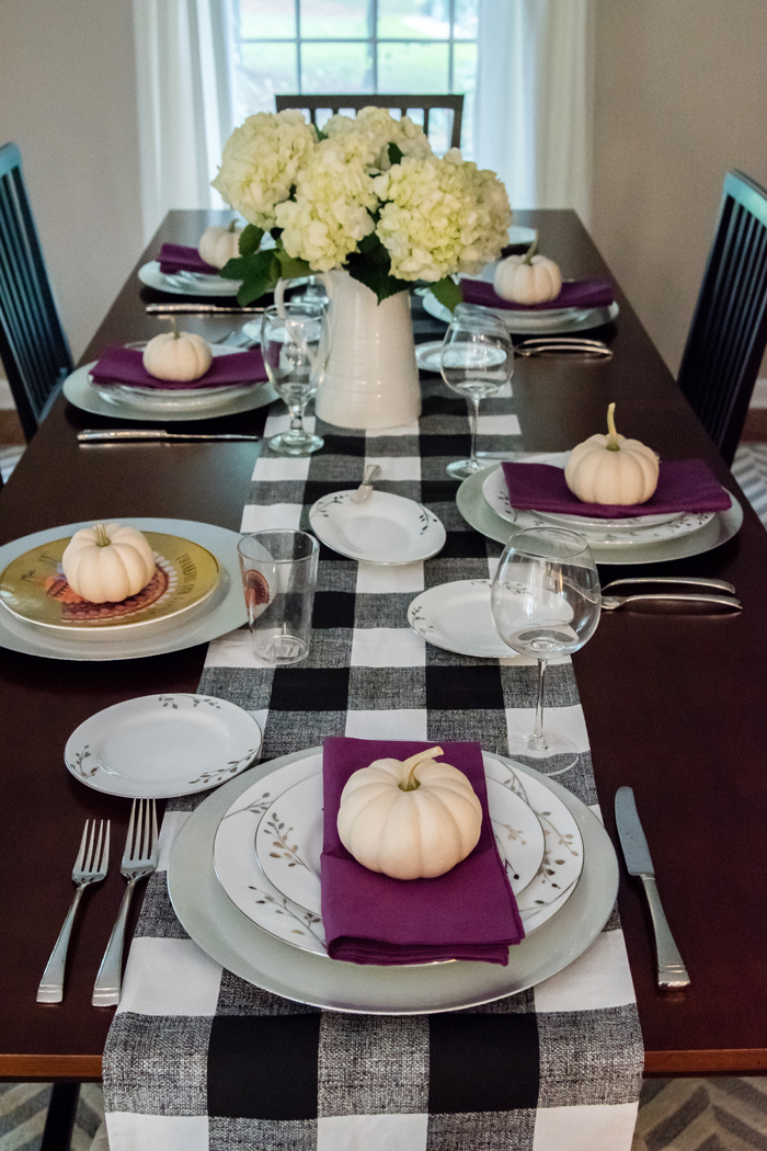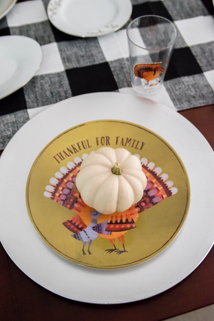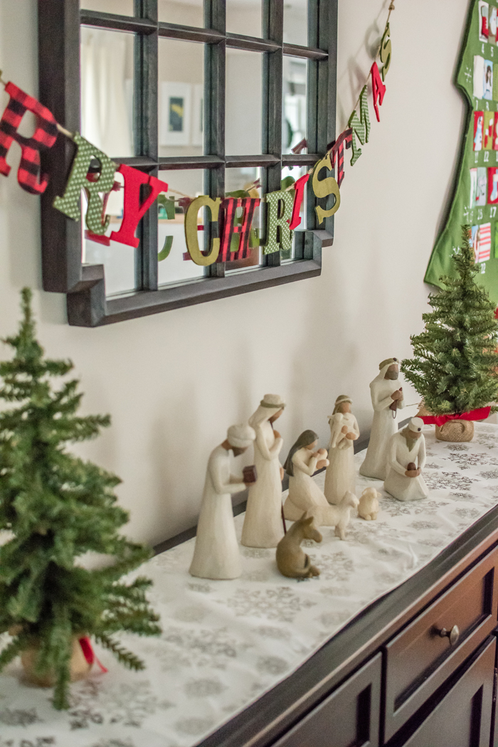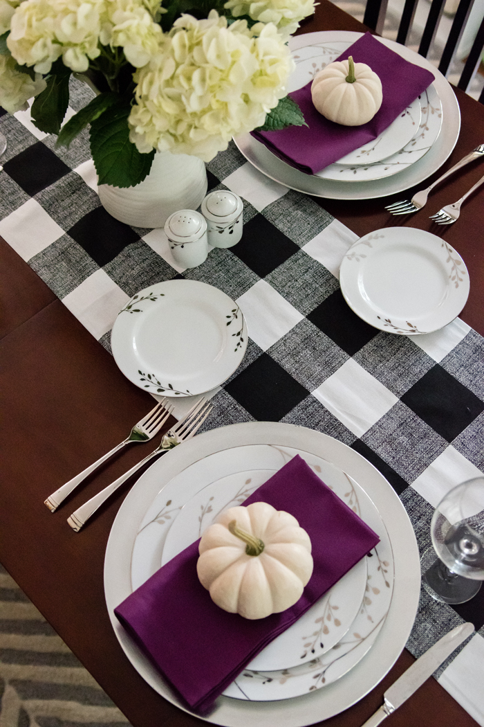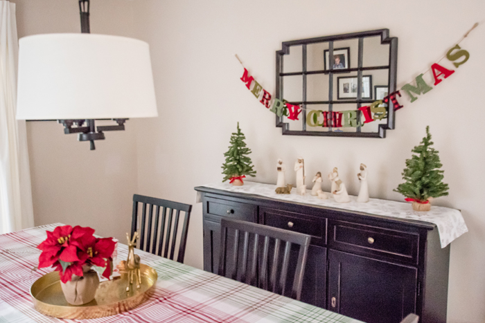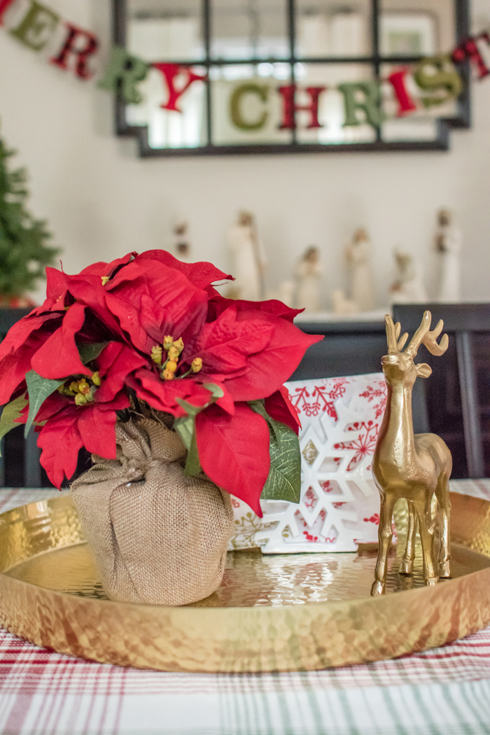 As for our dining room, I kept with my favorite decorating formula. Since we use our table for much more than dining (think game boards, puzzles, and Lego making), I prefer not to "set the table". Instead, I cover the table with a seasonally appropriate runner and add my new favorite gold tray filled with pretty decorative accessories as well as the necessities, like a box of tissues (cause Noah always seems to have a runny nose when we are in the middle of a game!).
