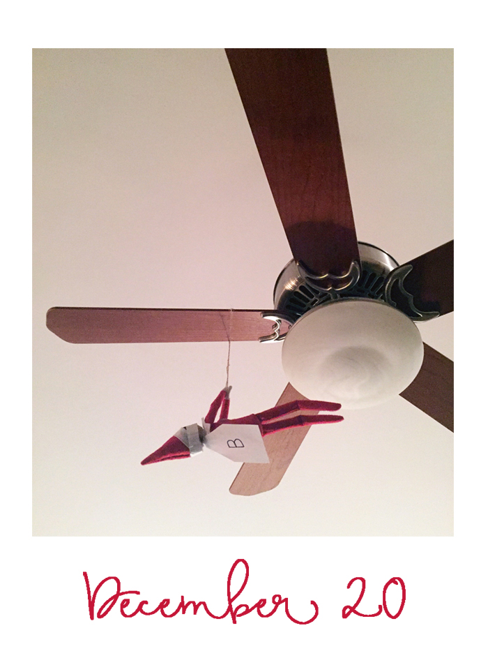 Super Buddy came back, this time hanging from the fan...