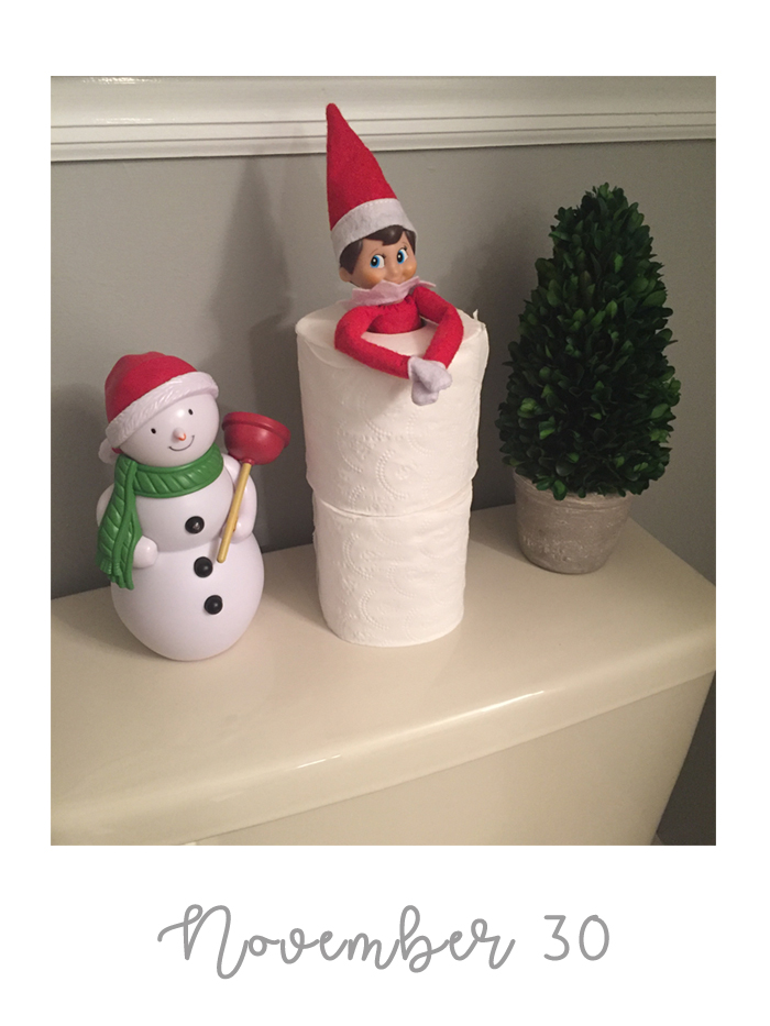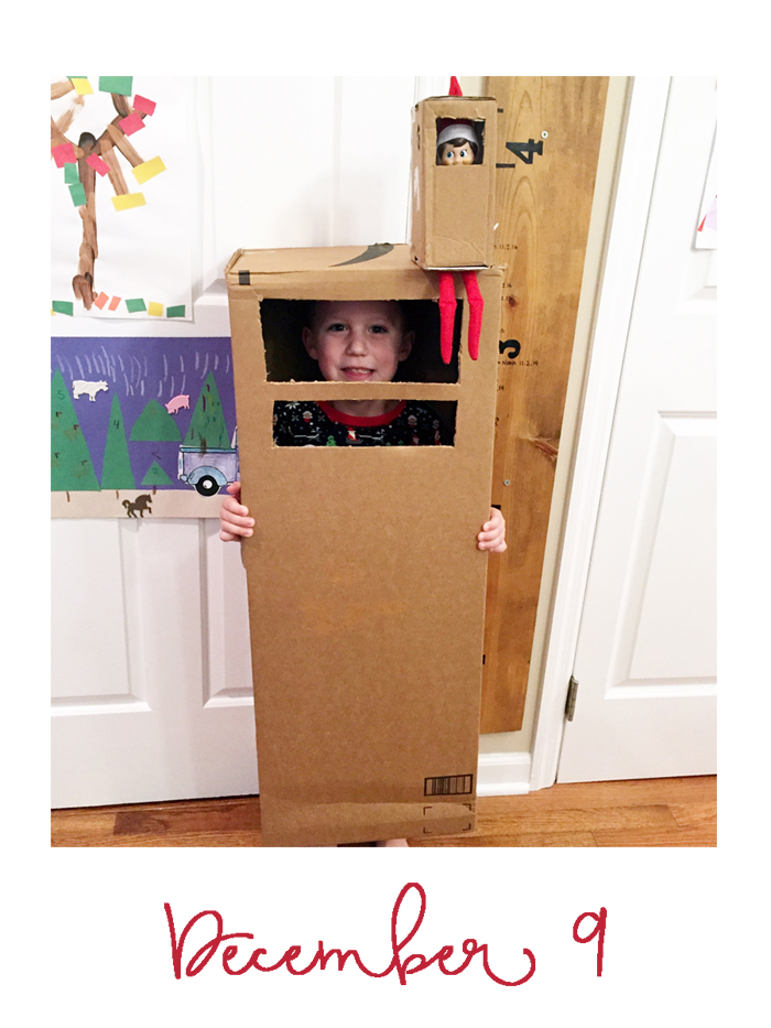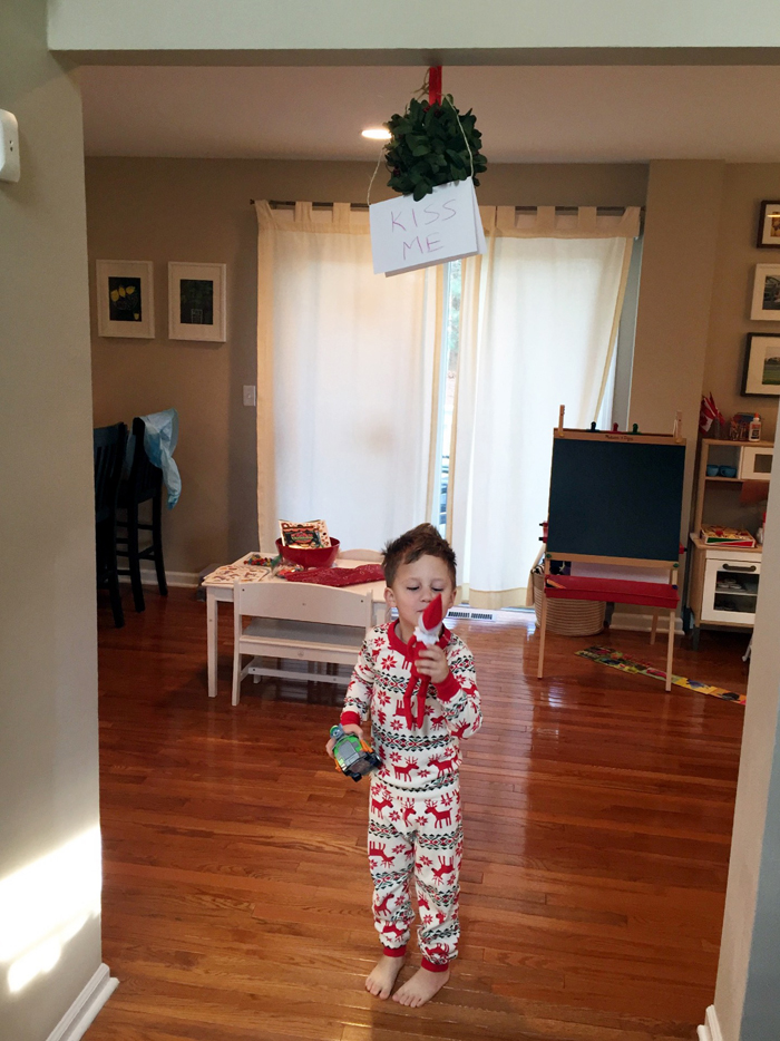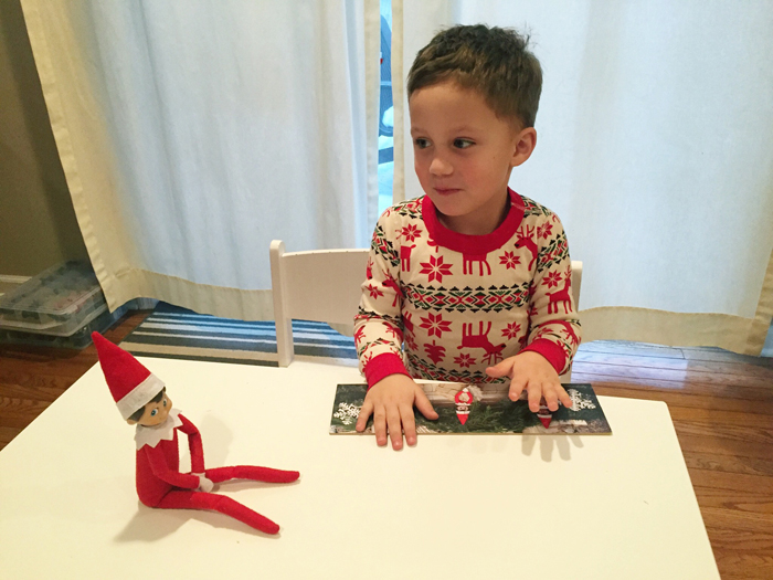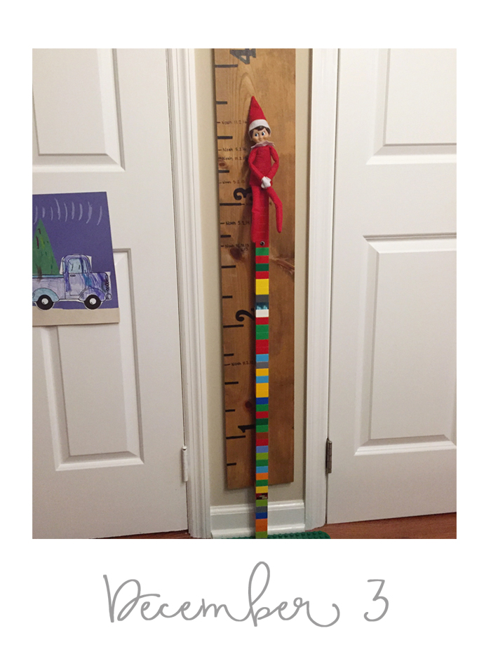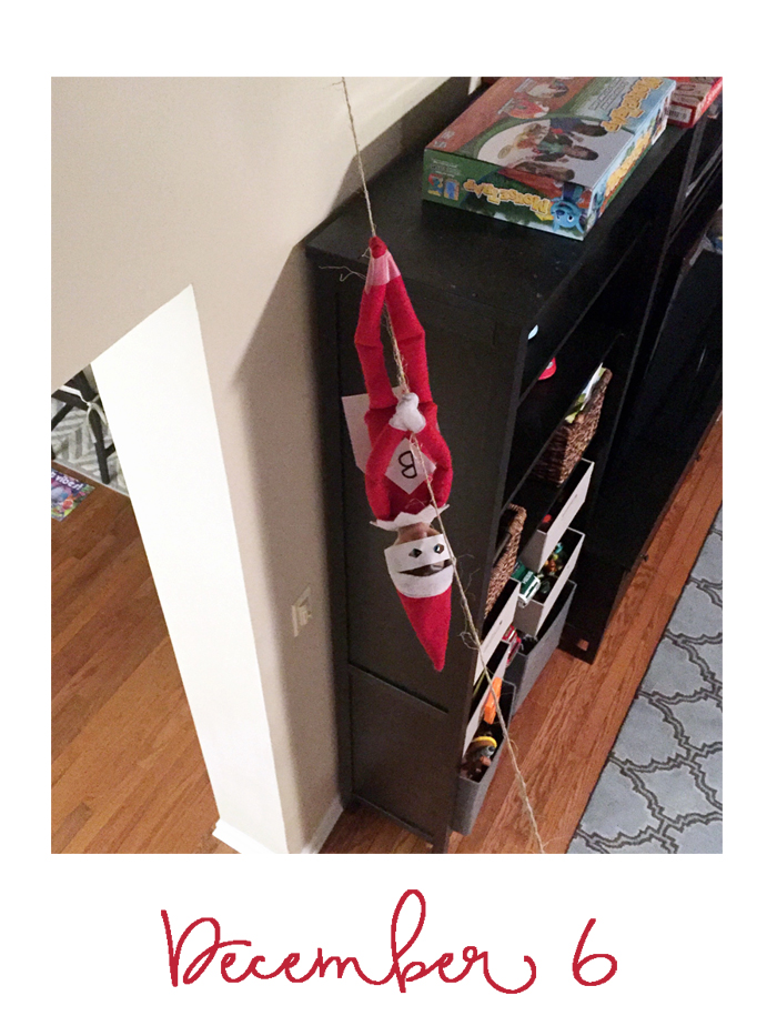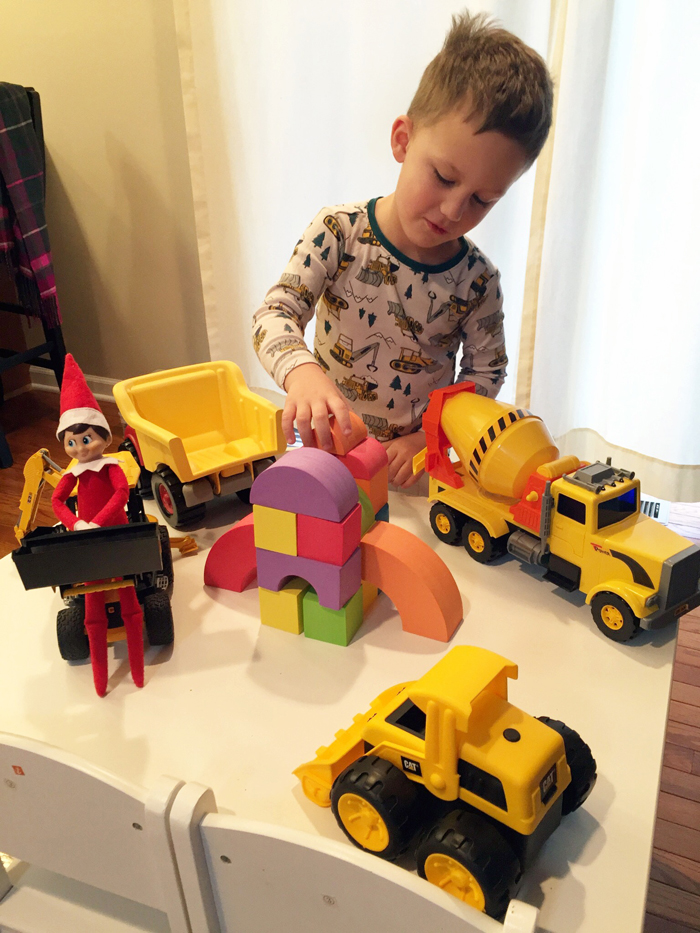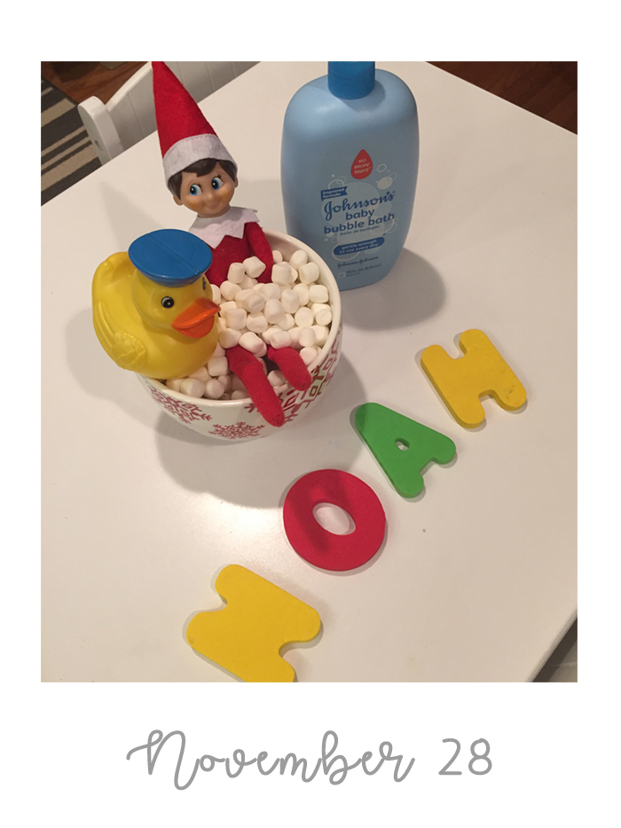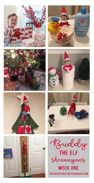 Last year was the first year we did the whole "elf on the shelf" thing. We decided to wait until Noah was old enough to really appreciate it. While our elf doesn't cause problems or make messes, he does move around each night and get himself into some pretty funny situations. And while I would love to take credit for Buddy's creative shenanigans, I can't... it's all thanks to Chris. As soon as we started talking about starting the elf on the shelf tradition, he was vocal that he wanted to have creative control. He comes up with all the ideas, executes them, and then sends me nightly photos of what Buddy is up to. Every morning, I record Noah looking for Buddy. Even though Chris can't be there every morning, he at least gets to see his reaction (which is usually pretty funny) on video... and I get to have a month's worth of videos for documentation purposes!