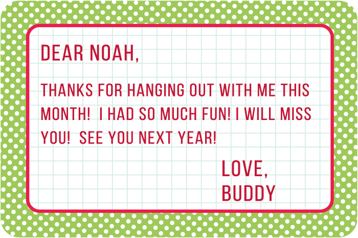 Tomorrow, Christmas Day morning, Buddy will be bringing Noah a small gift to say goodbye as well as this note. Until next year... it sure has been fun!