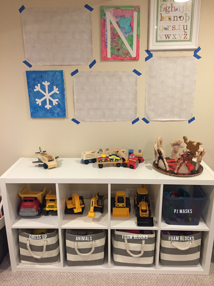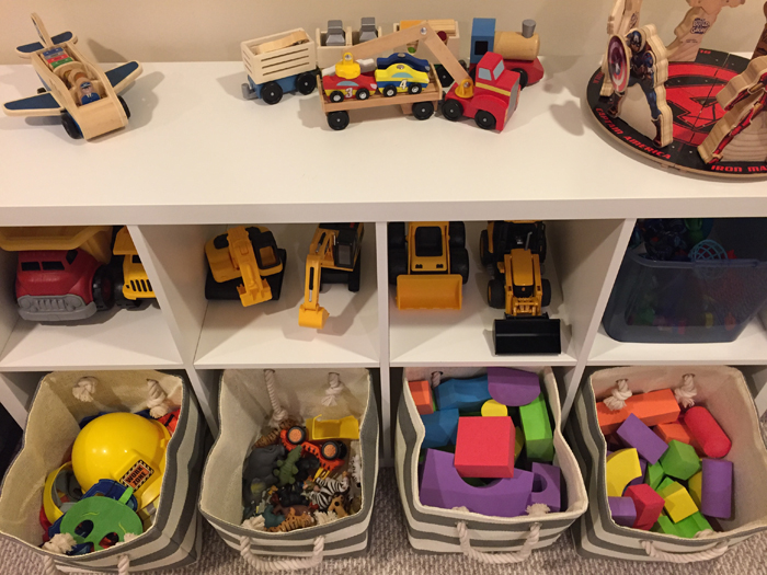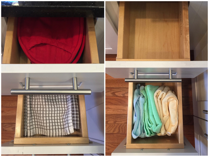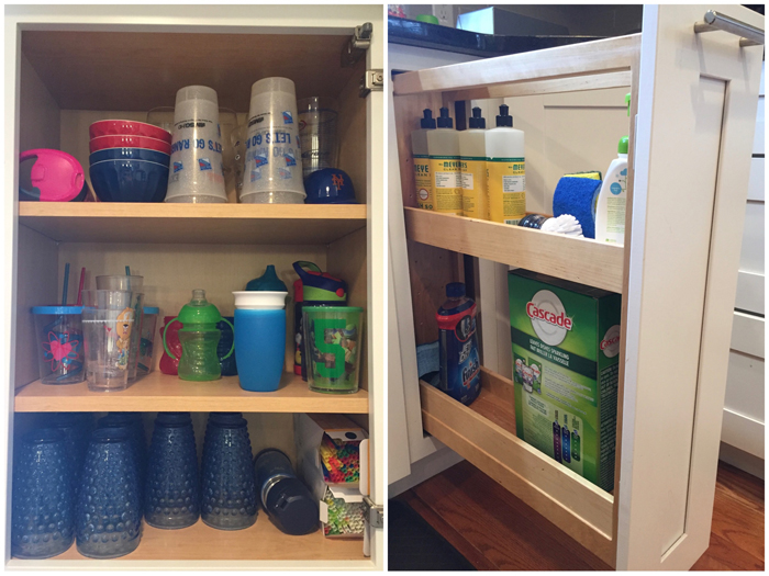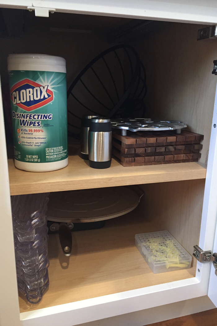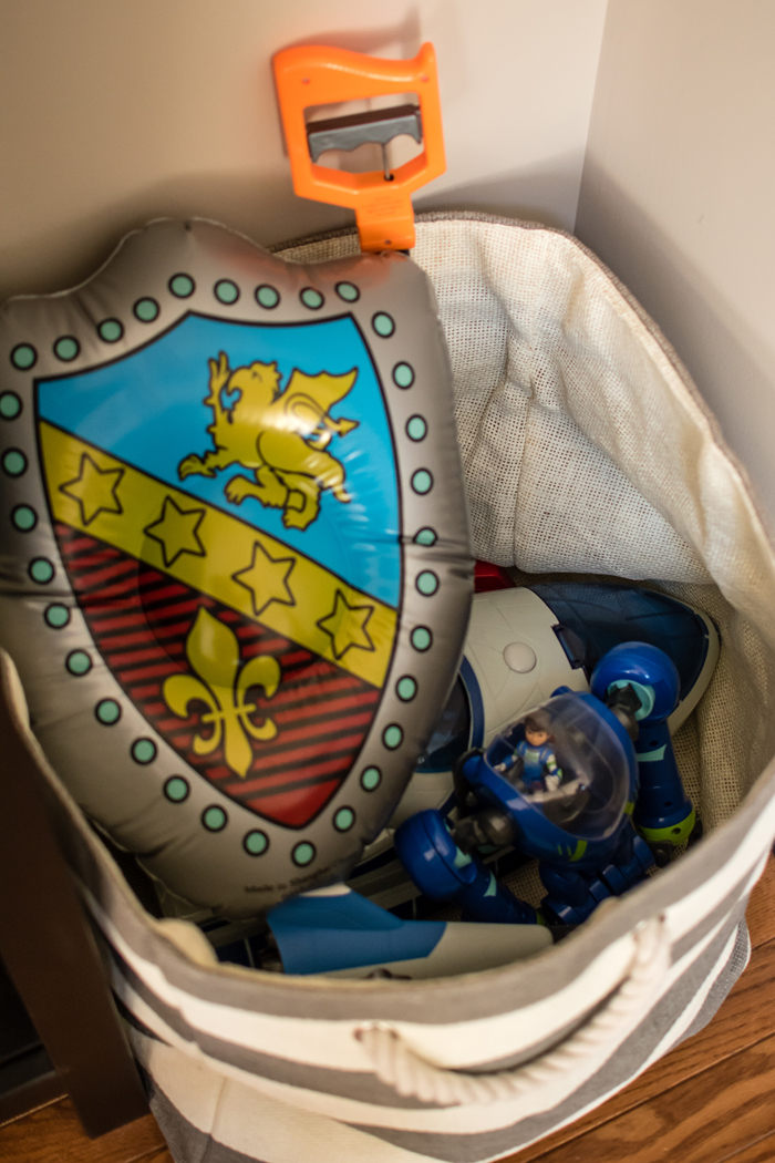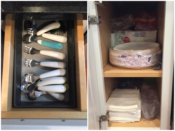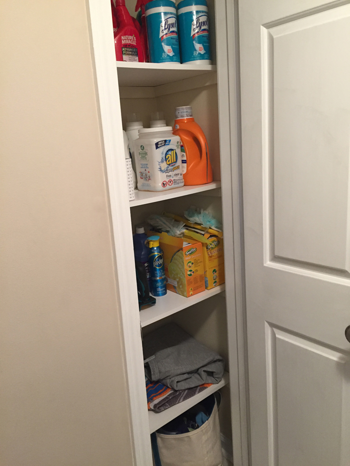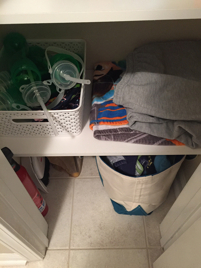 In addition to extra cleaning supplies, I also keep Noah's swim bag in the linen closet. I find it easy to just empty Noah's wet towels and swim suit into the washing machine, and then refill the bag as soon as everything has dried. It's so much easier knowing I'm prepared for the next week's class.