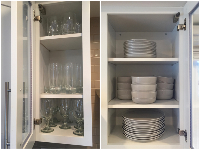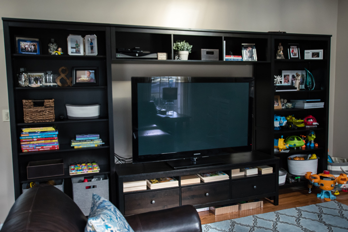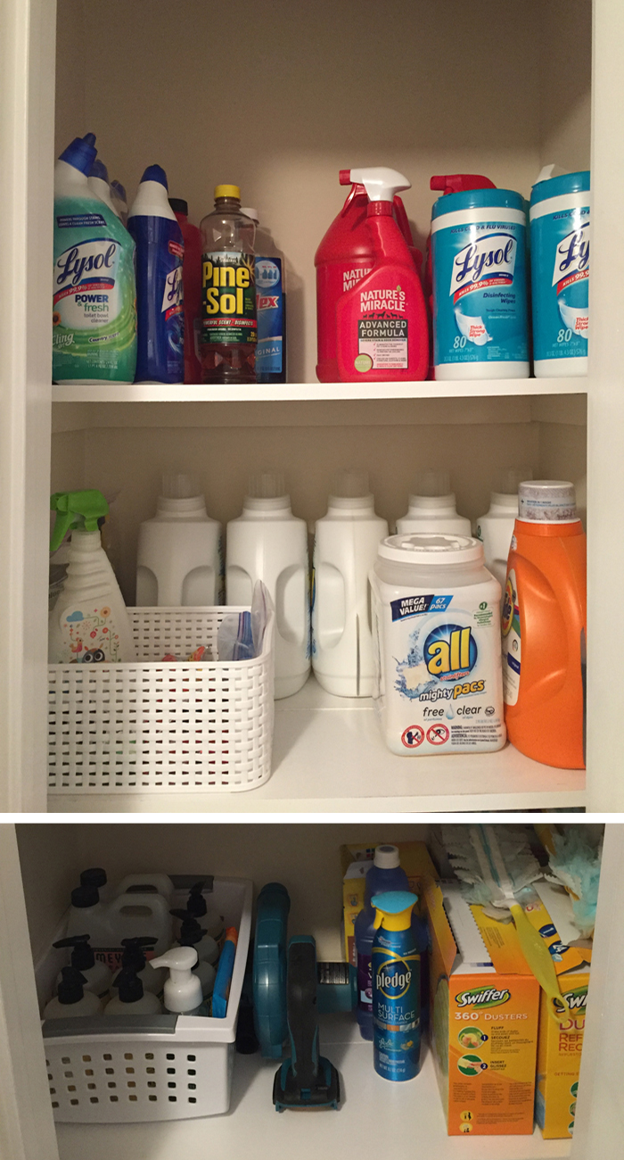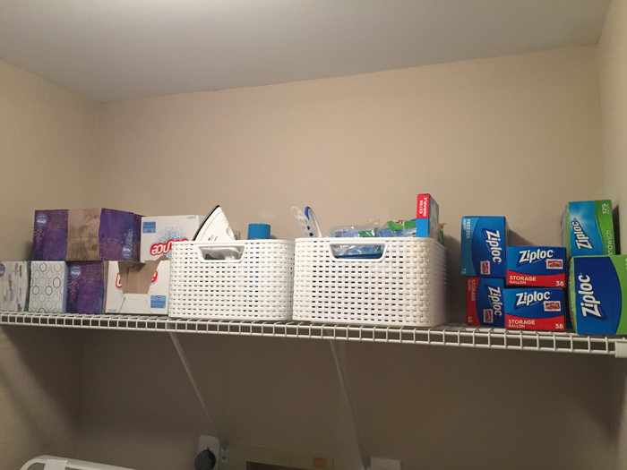 When we moved in, the laundry room had a small linen closet as well as a hanging rod above the machines. I knew I would need more storage than that, so we hung a simple wire shelf above the machines. In the future, we might upgrade to actually cabinets, but for right now this works well. We use this room to not only store our laundry needs, but also to store some extra bulk items, like tissue boxes, sponges, ziploc bags, and cleaning supplies. Chris loves buying in bulk, and as you can see from the photos, we are very well stocked! While I don't think I'll be buying sponges or detergent any time soon, I'm always amazed at how quickly we go through tissue boxes!