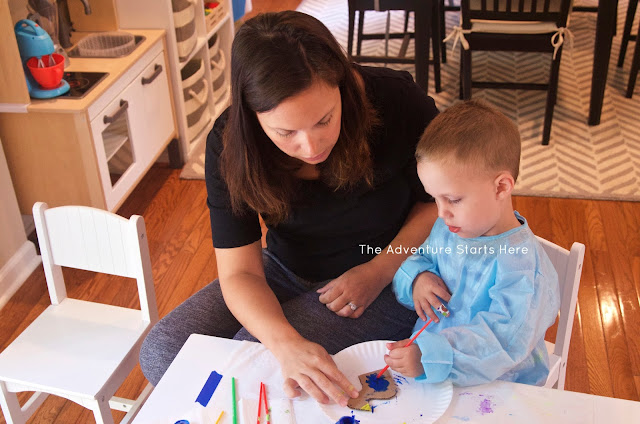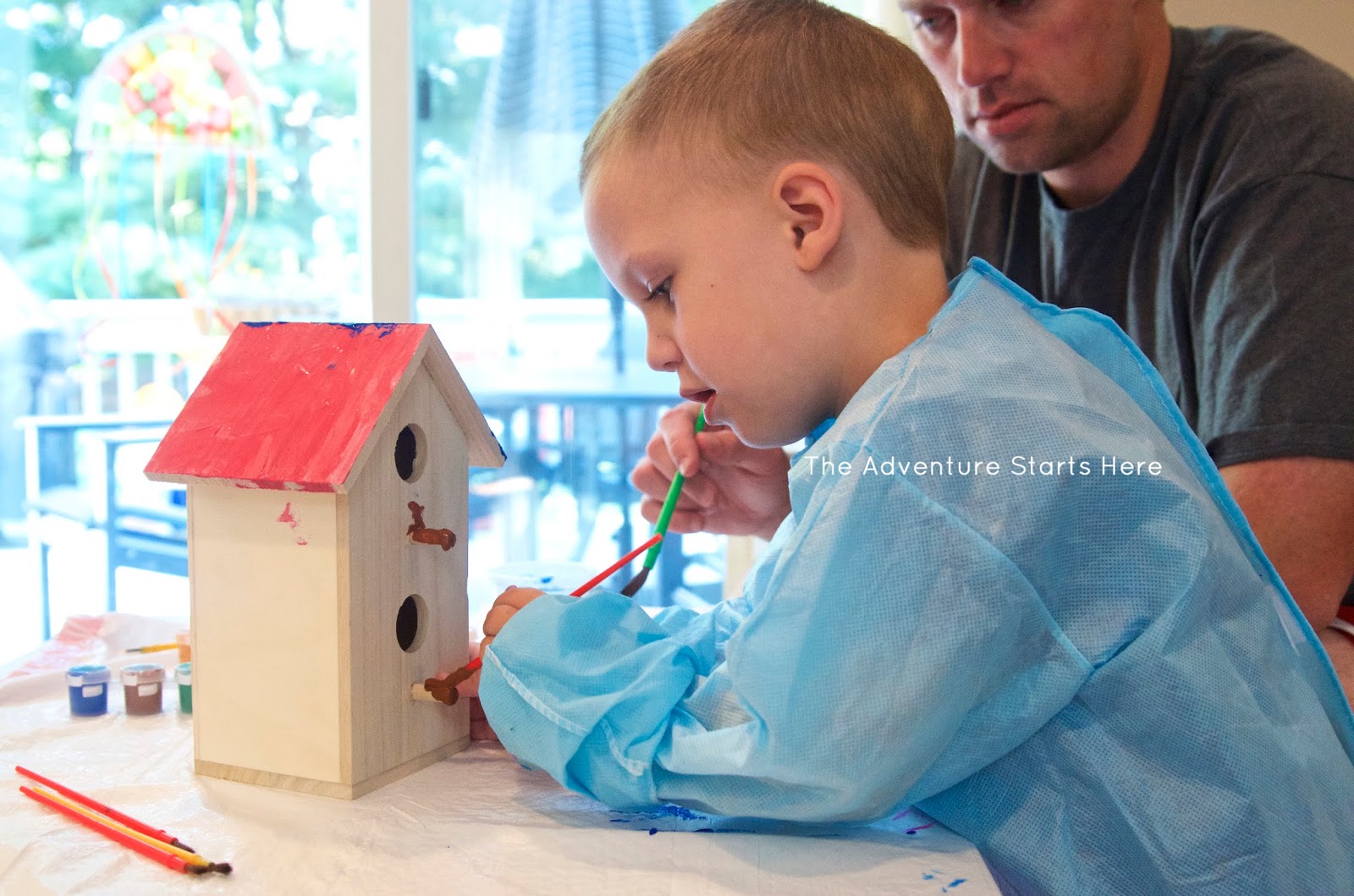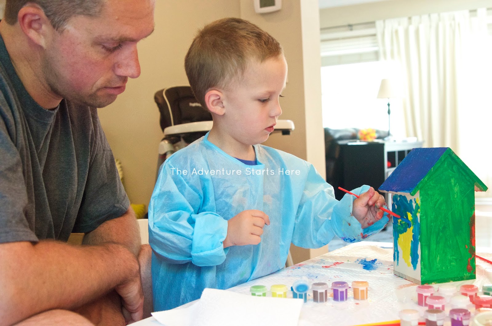 The first craft we did was painting a bird house with daddy over the weekend. Noah had fun painting a treasure chest at a birthday party, so I picked up this wooden bird house at Michaels thinking Noah would enjoy painting it as well. I took out a bunch of paints and brushes and let him pick what color to paint the house. He really enjoyed picking a new color for each side :)
