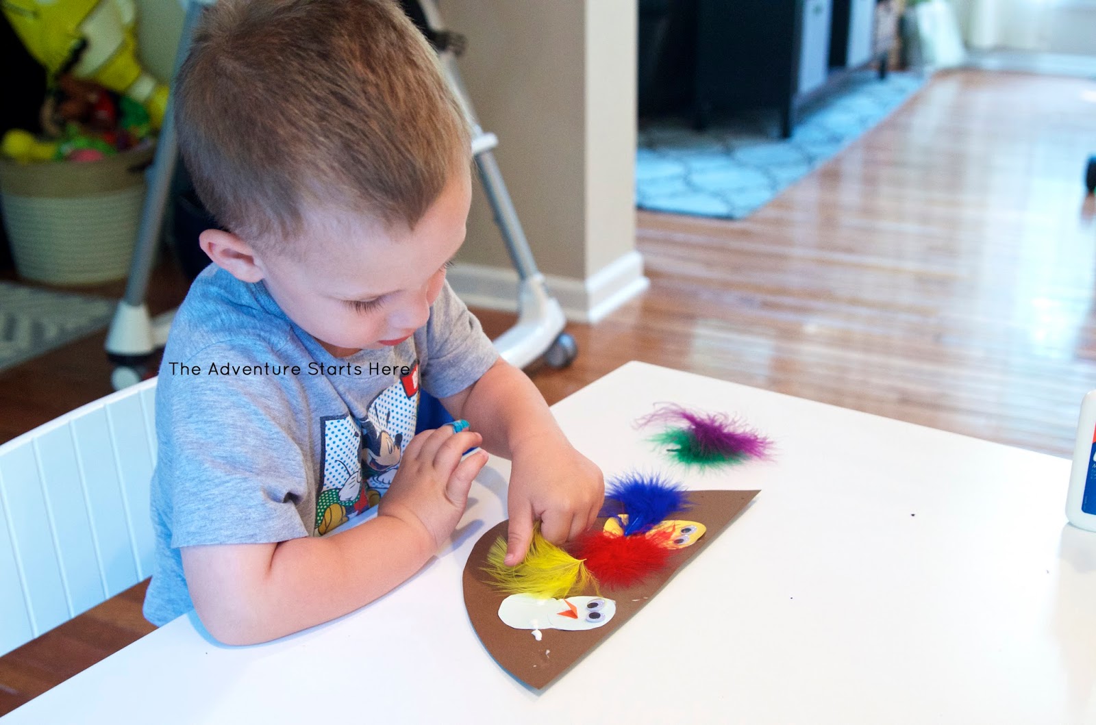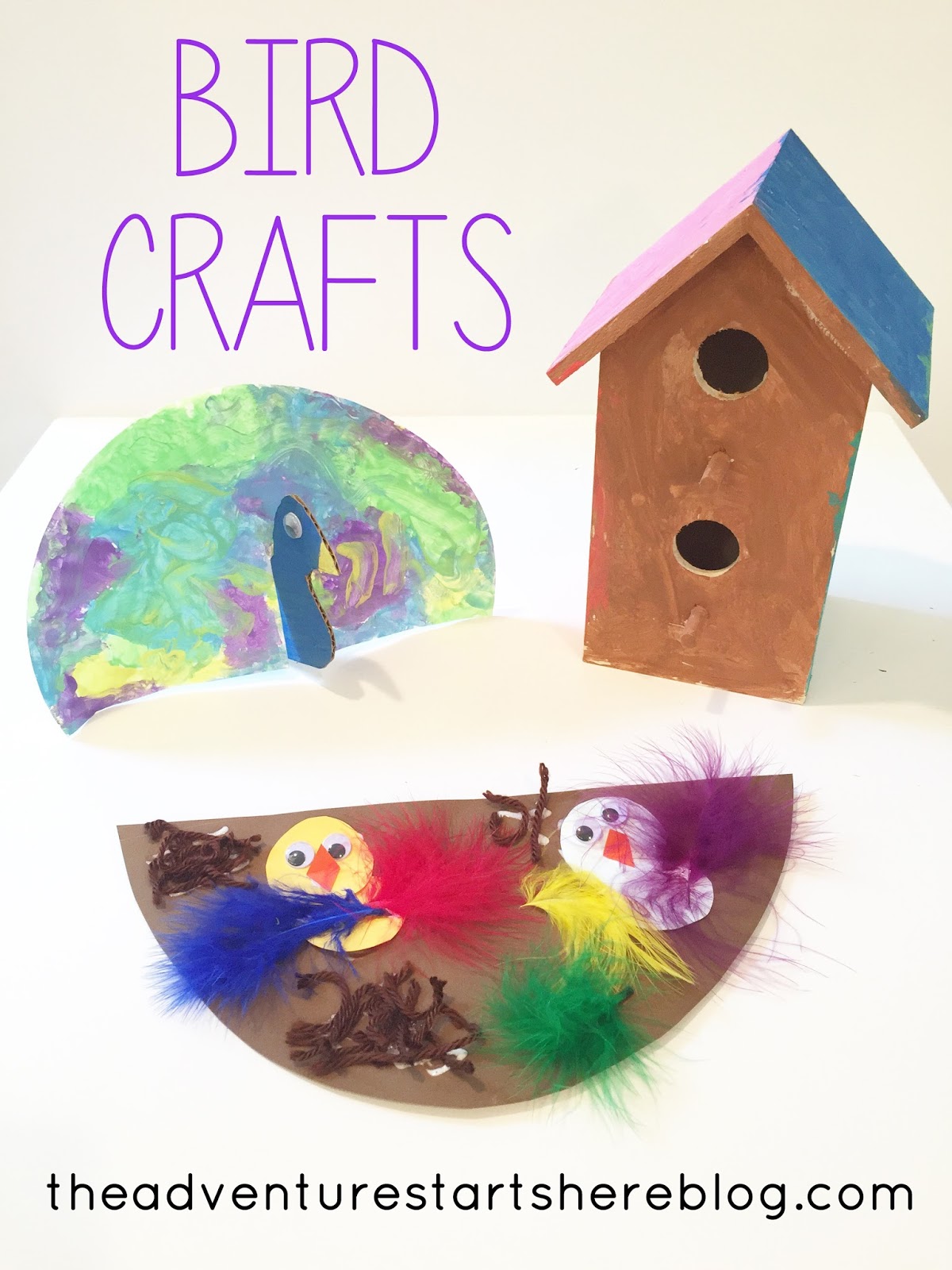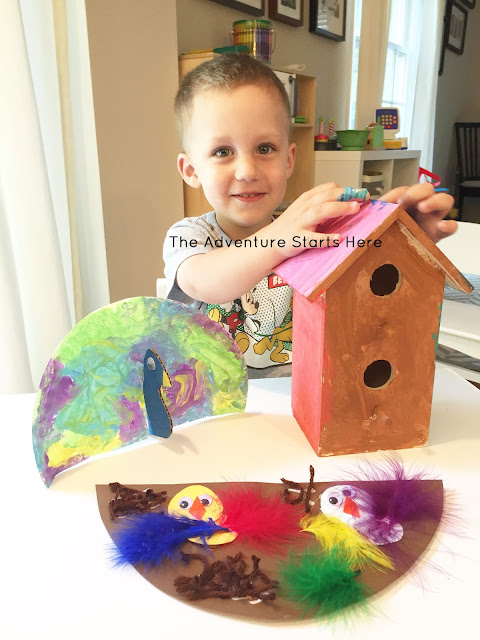 Last Friday, Noah and I went to the zoo with some friends. It's not a big zoo by any means, so it doesn't have african lions, elephants, or giraffes (yet). We still manage to have lots of fun by going on the train, carousel, and feeding the goats and birds! This was our second time feeding the birds. Noah held the stick to feed the birds on the ground as long as I stayed super close by. He was not willing to hold the stick in the air and let the bird climb right on top, but he sure was excited to watch me do it! And while I didn't get any pictures of them, we also saw 2 peacocks just walking around. I figured since we just saw them in person, it would be fun to make a few bird related crafts!